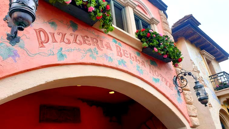 Côté ambiance, la pizzeria Bella Notte est un endroit vraiment charmant. La façade et la terrasse, qui se fondent parfaitement dans l’ambiance de Fantasyland, vous donnent un avant-goût de la décoration intérieure, qui reprend les éléments du dessin-animé « La Belle et le Clochard ». Les colonnes représentent les personnages de Tony, le patron du restaurant, et de Joe, son chef cuisinier. Sans oublier la scène mythique de Lady et Clochard, reproduite en peinture sur l’un des murs de la salle.