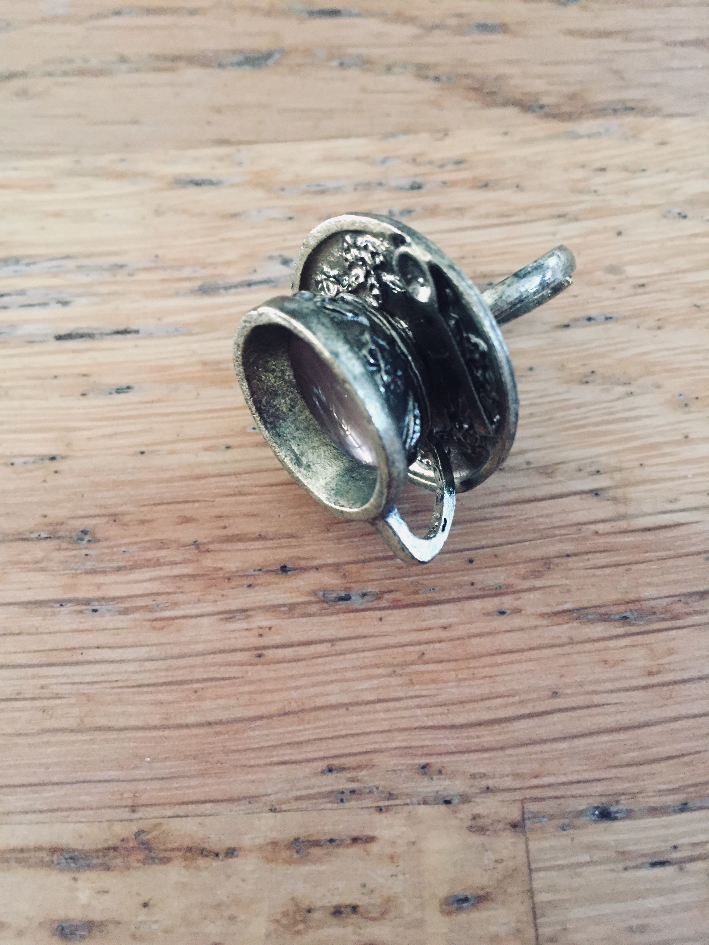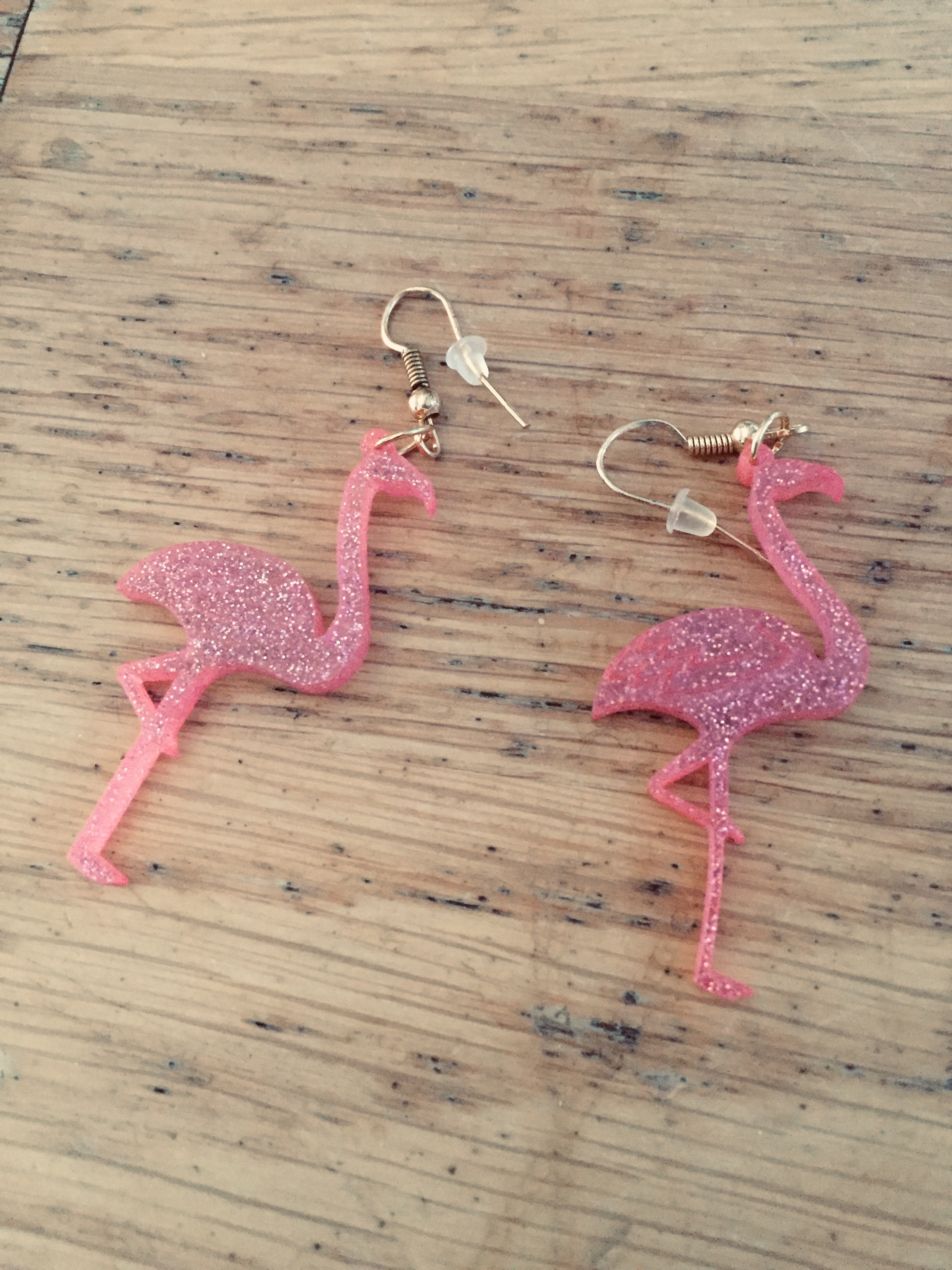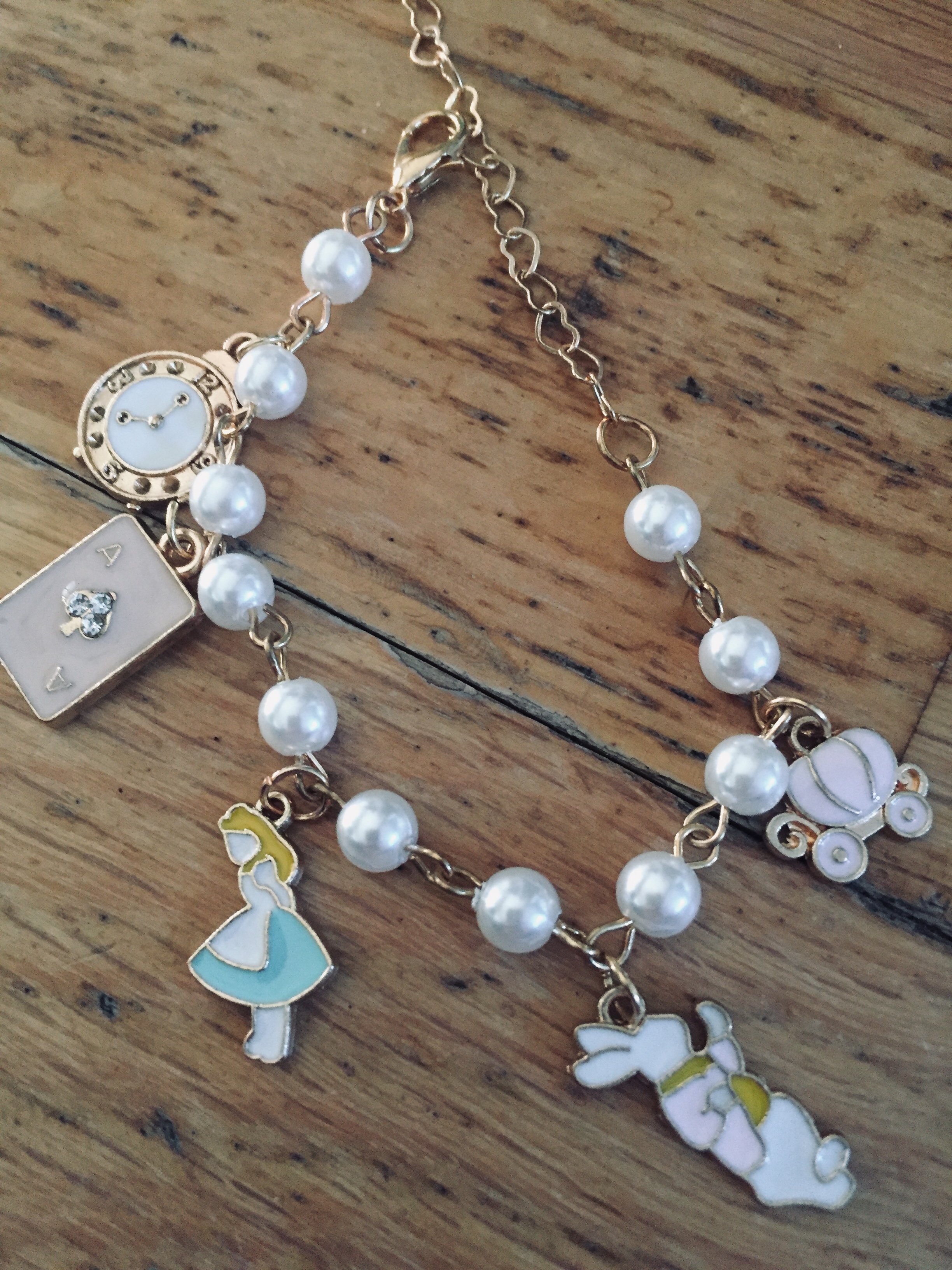 Pour les accessoires, j’ai trouvé un joli bracelet, des boucles d’oreille flamand rose, une bague tasse de thé et un pins du chat du Cheshire.