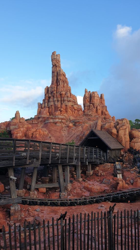 C’est parti: direction Frontierland ! Les allées sont vides, idem pour les files d’attente des attractions. Big Thunder Mountain affiche 5 minutes. Aucune hésitation: Gabin étant trop petit, nous embarquons chacun notre tour pour la randonnée la plus dingue de l’Ouest ! L’attraction est similaire au « train de la mine » de Disneyland Paris. Mais nous gardons quand même un coup de coeur pour la version française, qui nous emmène au beau milieu du lac de Frontierland.