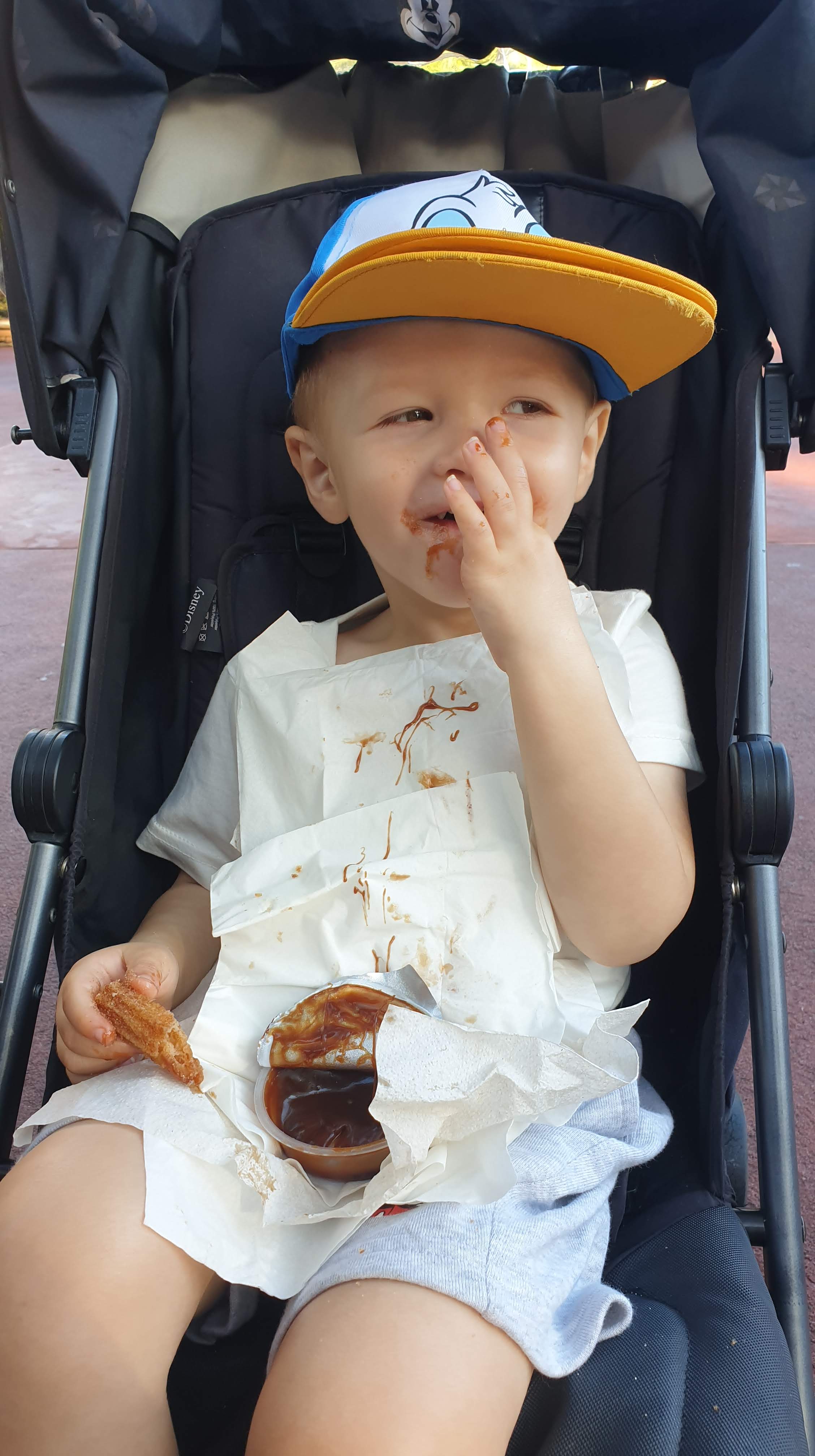 Pendant que papa et Ethan font l’attraction, Gabin s’amuse avec maman dans l’aire de jeux. Puis c’est au tour de maman de faire l’attraction avec Ethan (quel chanceux, le Baby Switch lui permet d’en profiter 2 fois plus). Mais pour Gabin, le temps est un peu long, et l’estomac se creuse. Heureusement, un stand près de l’attraction vend des churros à la cannelle, à tremper dans une pâte au chocolat ! Gabin se régale, et ça ouvre l’appétit à maman, qui revient trempée de l’attraction.