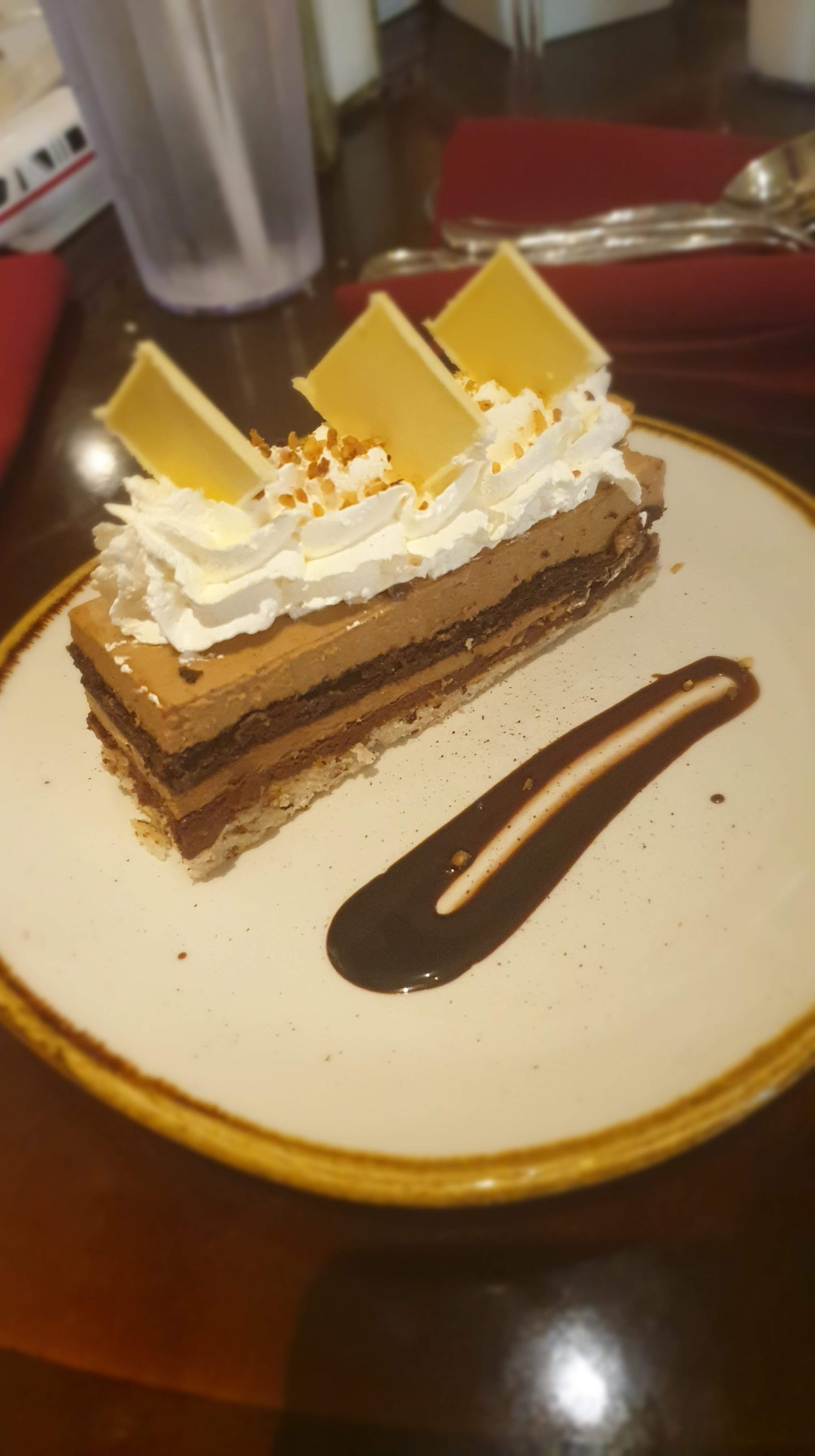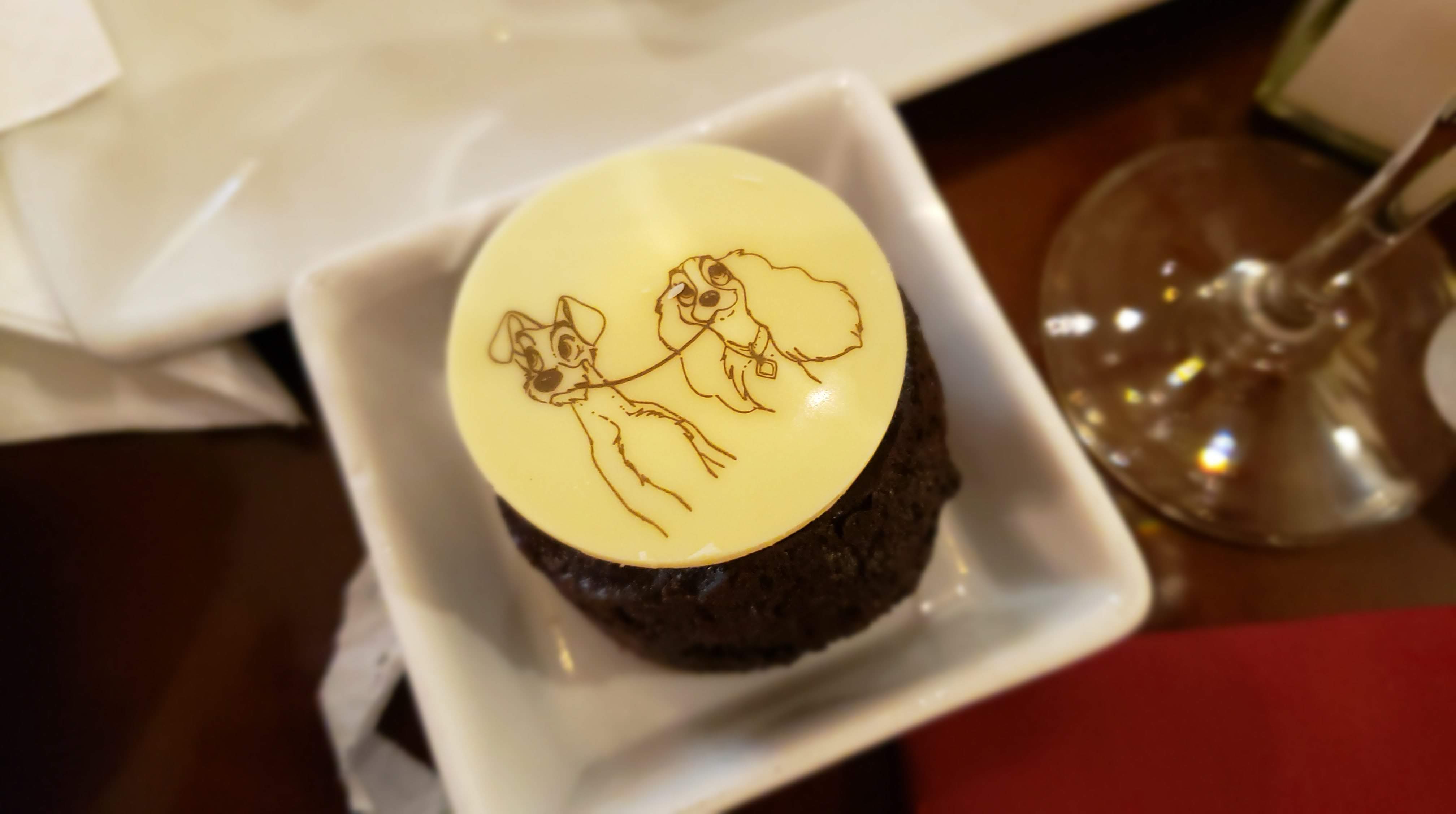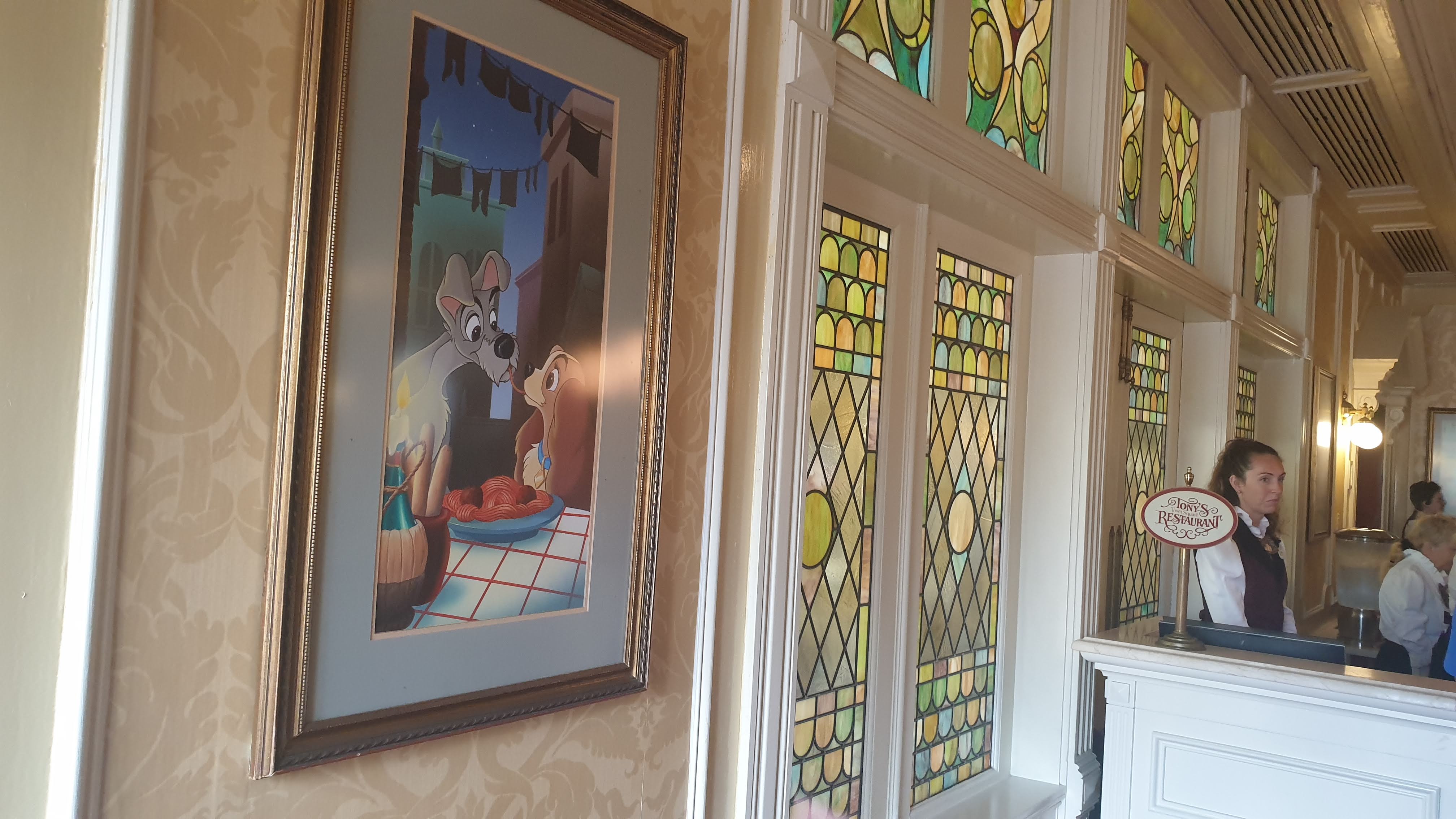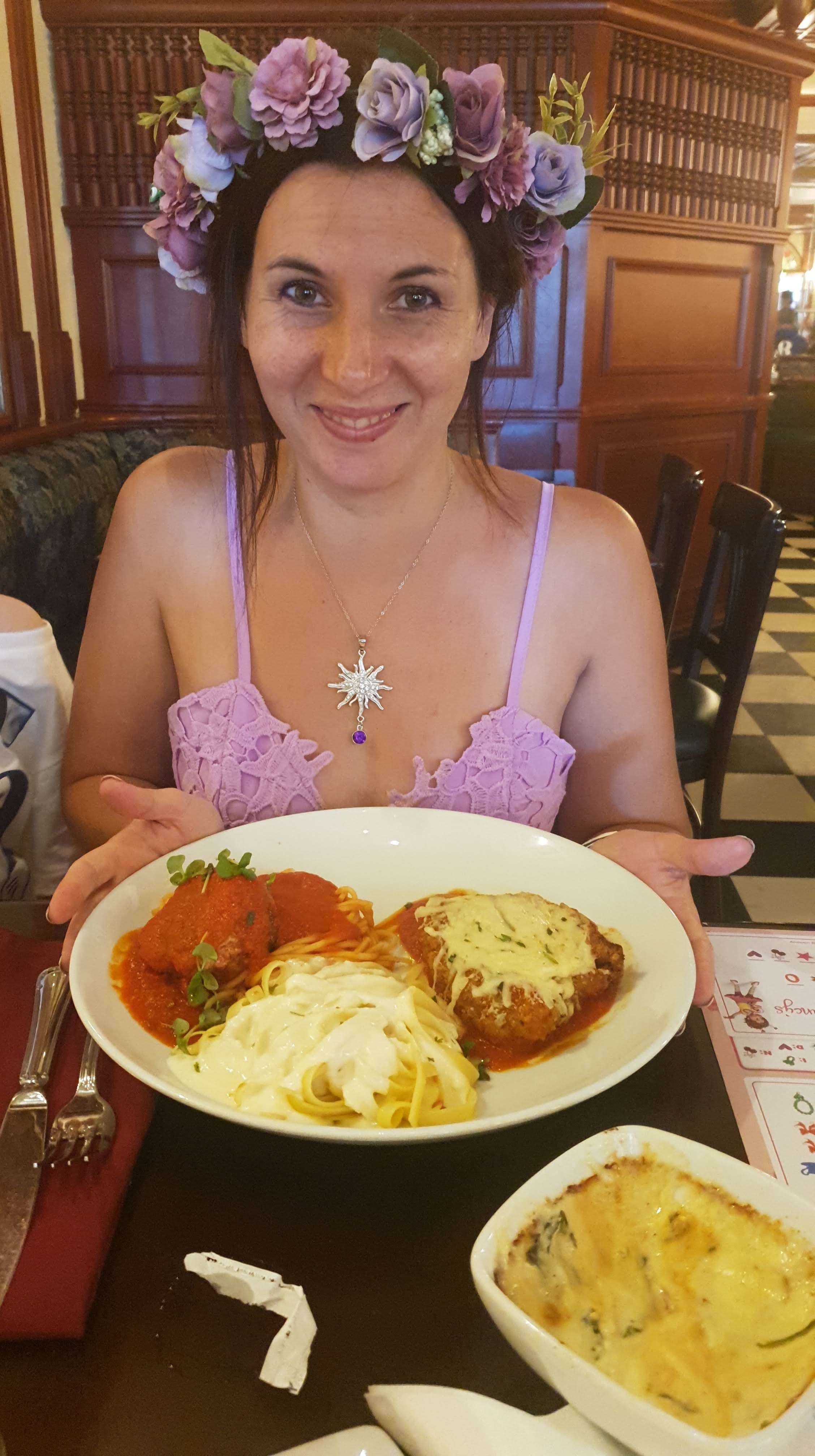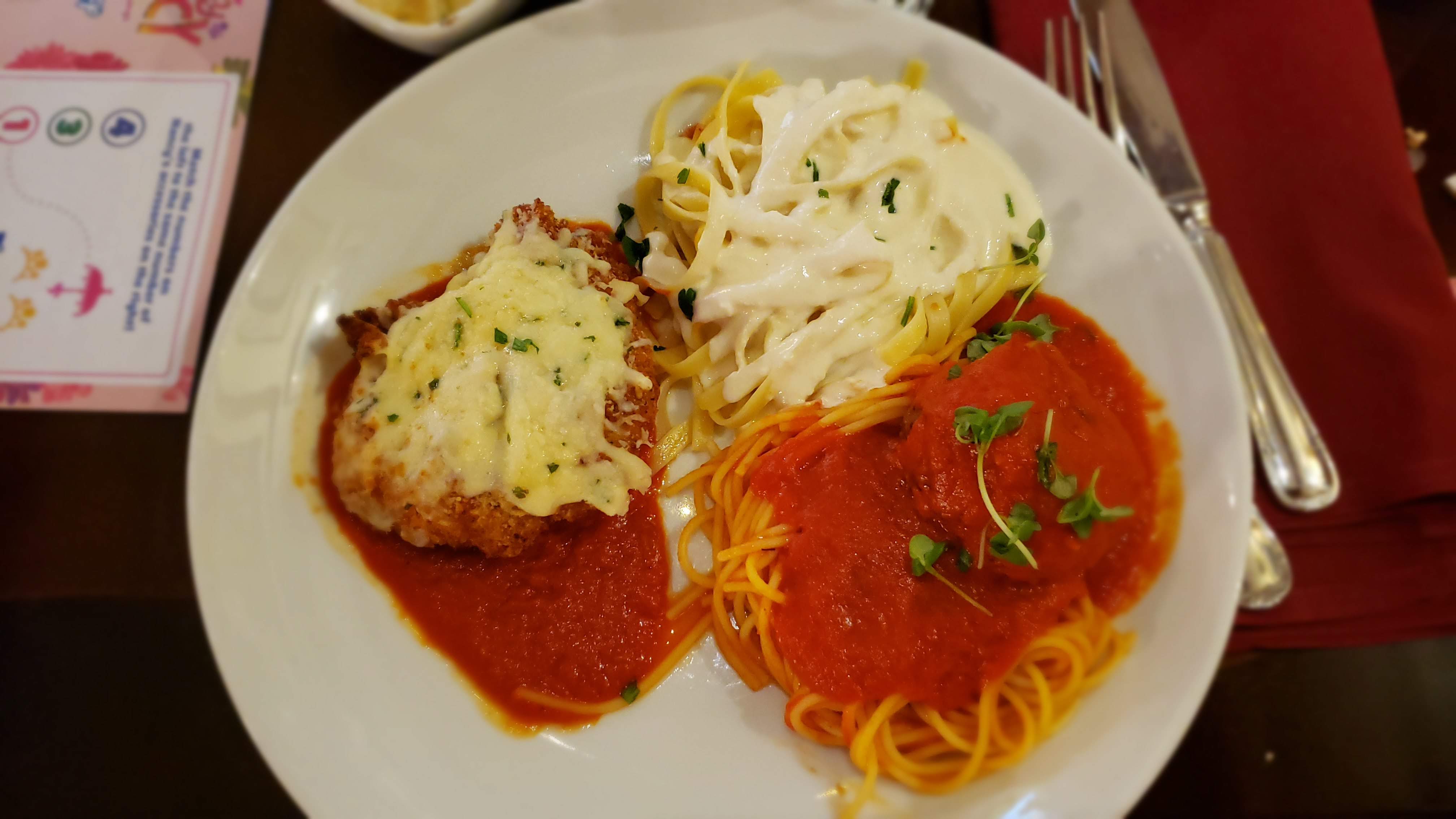 Attention, critique incisive. Depuis le début de notre séjour, nous avons toujours été conquis par les restaurants dans lesquels nous avons mangé. Mais ça, c’était avant le Tony’s Town Square. Nous avons réservé ce restaurant pour 2 raisons: la première, c’est que le parc Magic Kingdom n’offre pas énormément de choix en restaurants à table. La deuxième, c’est que le Tony’s Town Square propose un package repas + emplacement VIP pour la parade. Nous voilà donc installés à la table du restaurant, où la serveuse nous conseille sur un excellent vin. Hélas, c’est la seule chose que nous retiendrons du repas. Même si la formule est avantageuse puisqu’elle permet d’avoir entrée-plat-dessert, la qualité n’est pas à la hauteur. Seule l’entrée (ailerons de poulet à l’ail pour Jérôme, pain à l’ail avec sauce tomate pour Amandine) relevait le niveau du menu. Pour le plat, nous avions tous les deux choisi l’Italian Trio, composé d’un poulet parimigiana, de Fetuccine sauce Alfredo et spaghetti-boulette à la sauce tomate, comme dans le célèbre film « La Belle et le Clochard », qui donne sa décoration au restaurant. Niveau quantité, vous ne serez pas déçu. Nous pensions avoir des petites portions de chaque plat, mais aux Etats-Unis, tout est démesuré. Ce n’était pas une assiette, mais un saladier, avec une énorme portion de chaque plat. Même pour nous qui sommes bons mangeurs, c’était impossible de tout finir. Et de toute façon, soyons clairs: ce n’était pas bon. Cela ressemblait à la nourriture d’une mauvaise cantine. Pareil pour le dessert, un gâteau chocolat noisette sans saveur. Peut-être nos choix n’étaient-ils pas les bons, mais nous ne garderons pas un grand souvenir de ce repas au Tony’s Town Square.