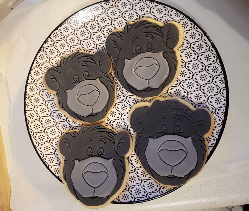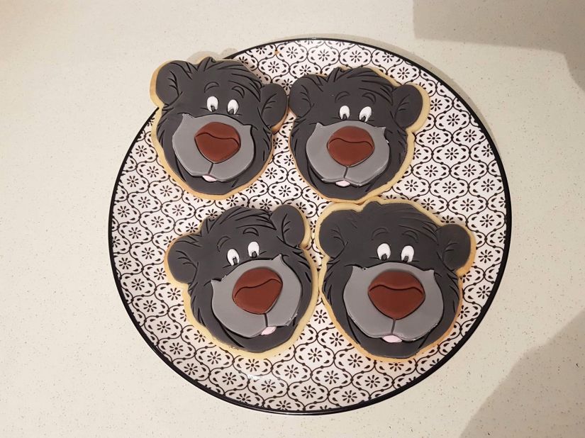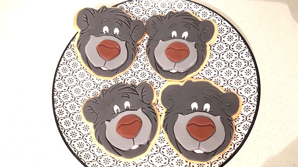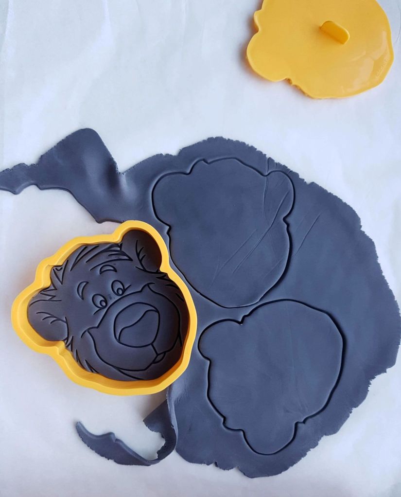 Il est désormais temps de décorer votre sablé avec de la pâte à sucre. Etalez d’abord la pâte à sucre grise et utiliser l’emporte-pièce et l’embosseur pour obtenir le visage de Baloo. Placez-le sur vos sablés.