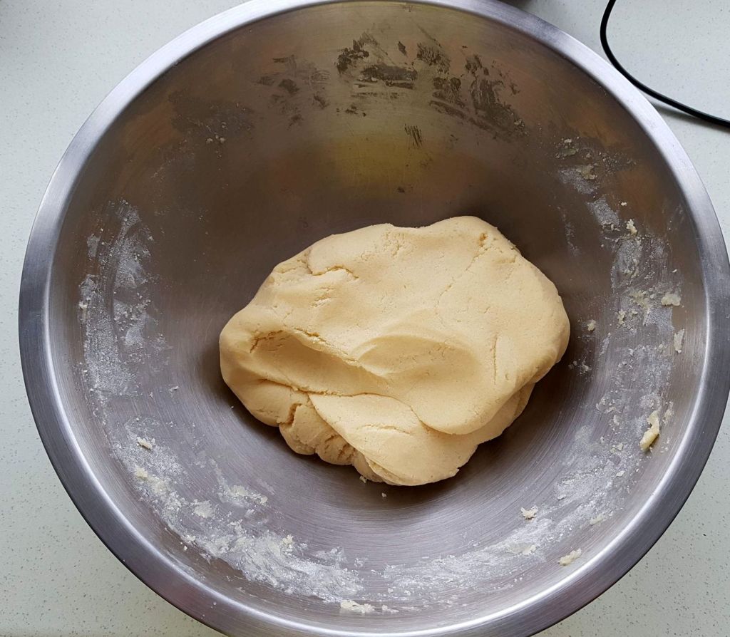 Lorsque la pâte devient difficile à mélanger, continuez avec vos mains. Formez une boule et placez-la sur une surface de travail.