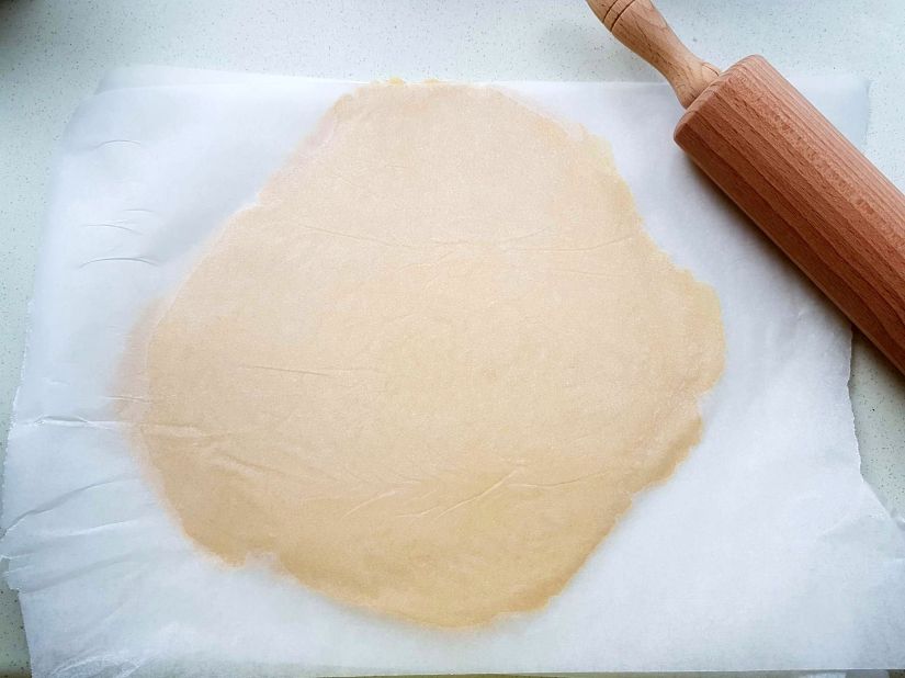 Etalez la pâte entre deux feuilles de cuisson à l’aide d’un rouleau, jusqu’à obtenir une épaisseur d’environ 5mm. Laissez reposer 30 minutes.