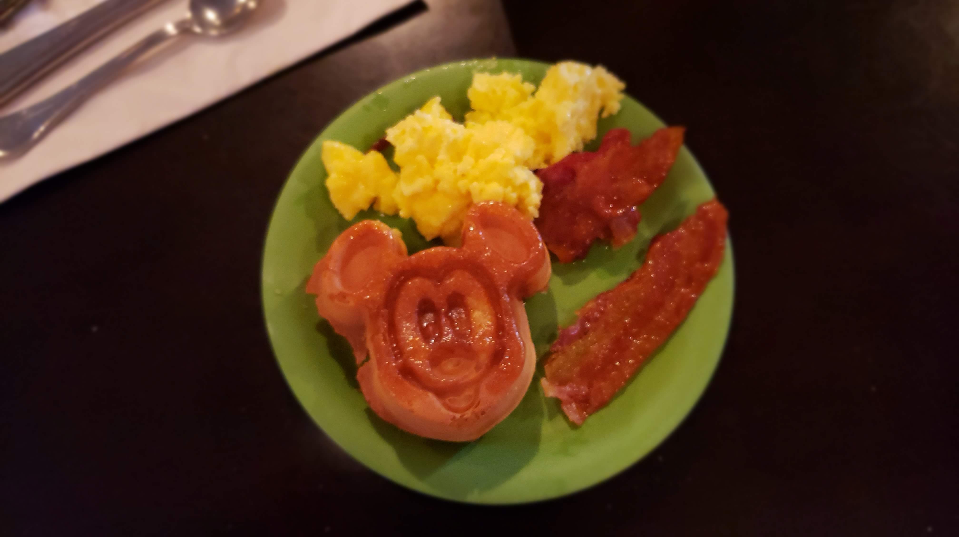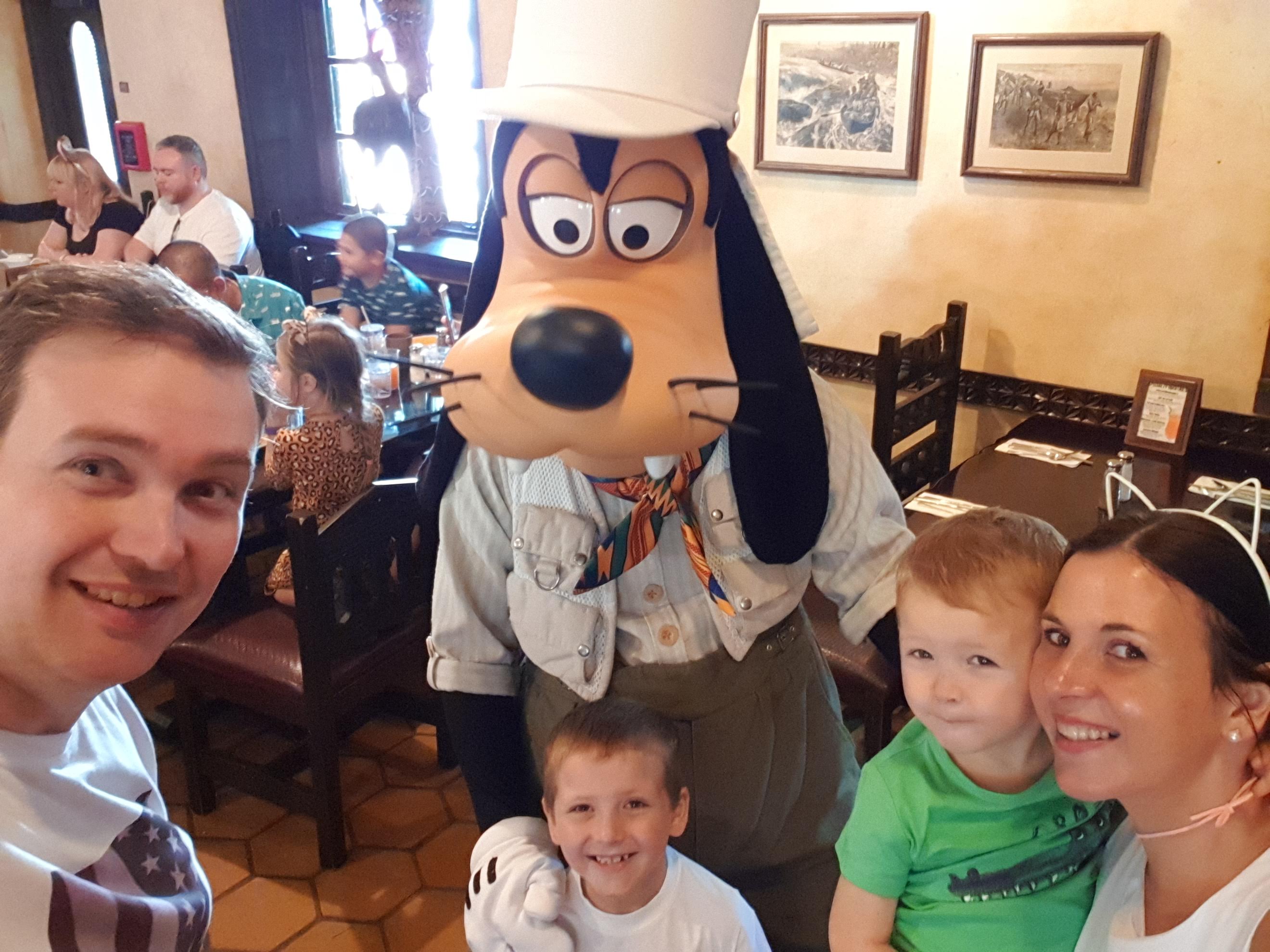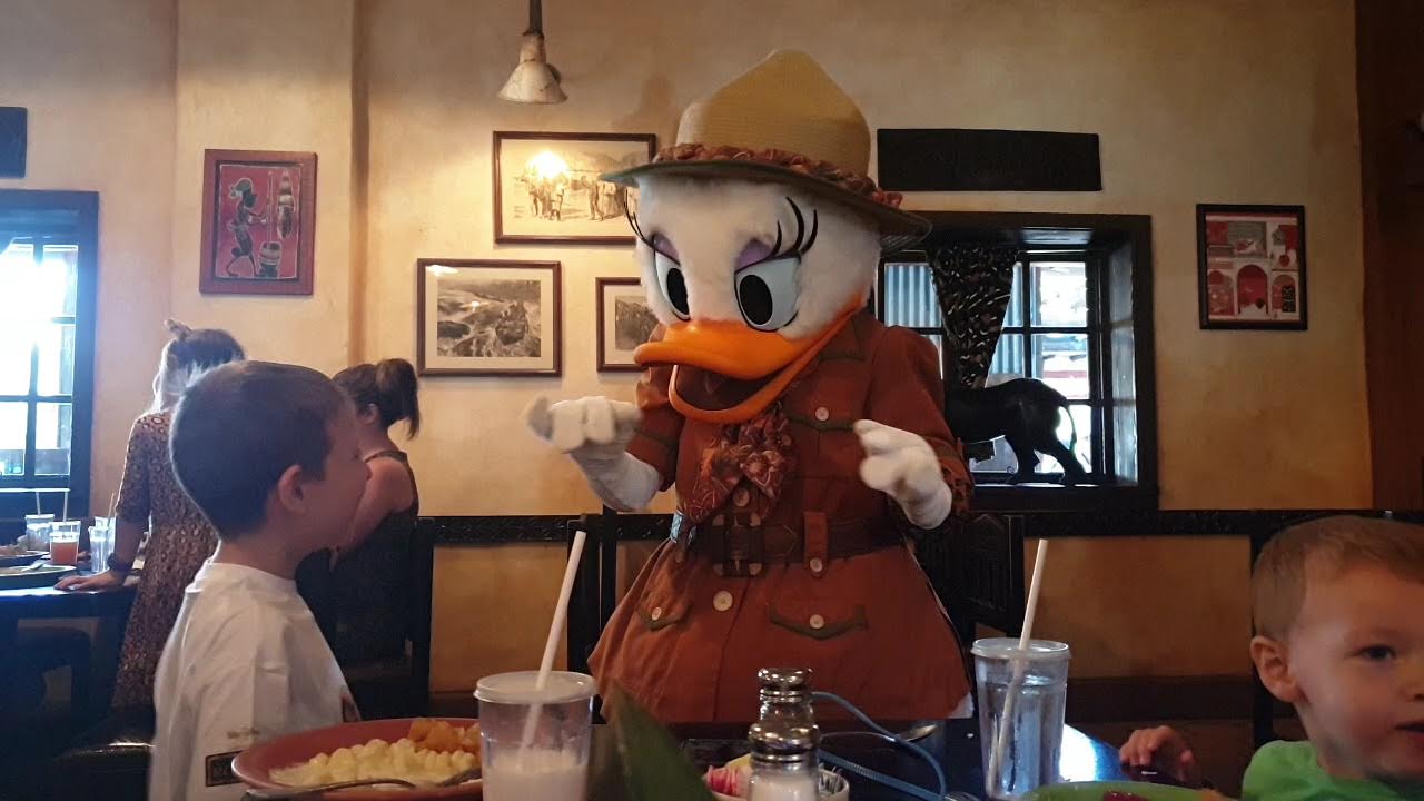 Après être passé devant le majestueux « arbre de la vie » qui trône au milieu du parc, nous voici arrivés dans la section « Afrique ». Nous avons une réservation au « Tusker House », un restaurant avec une formule buffet à volonté avec Mickey, Dingo, Donald et Daisy en tenue de safari. Le cadre est très sympa: nous sommes plongés dans un souk africain dont les stands proposent des plats divers et variés. L’avantage de prendre une réservation en fin de matinée, c’est qu’il est possible de profiter du buffet du petit-dejeuner. Nous débutons donc le repas par quelques gaufres Mickey accompagnées d’omelette et de bacon. En entrée, le restaurant propose différentes sortes de pain et de houmous (tomate, ail, nature, etc), des salades et des fruits frais. En plat principal, poulet curry, légumes tandoori, saumon, riz blanc, riz aux pois chiches et aux épices, bananes plantains, purée, et plein d’autres mets composent le buffet. Pour les plus difficiles, direction le buffet enfant, qui propose des corn-dogs, des nuggets, des frites, et d’autres choses plus classiques. Enfin, côté desserts, on se régale avec des cookies chocolat et raisin, cheesecake chocolat ou chocolat blanc/framboise, et du pudding chocolat-banane. A noter que le restaurant propose un package « buffet + emplacement VIP pour le spectacle nocturne Rivers of Light ». Si vous payez sur place, le tarif est plus cher. Avec un Dining Plan, le coût est le même: un crédit par personne. Evidemment, nous avons réservé le package !