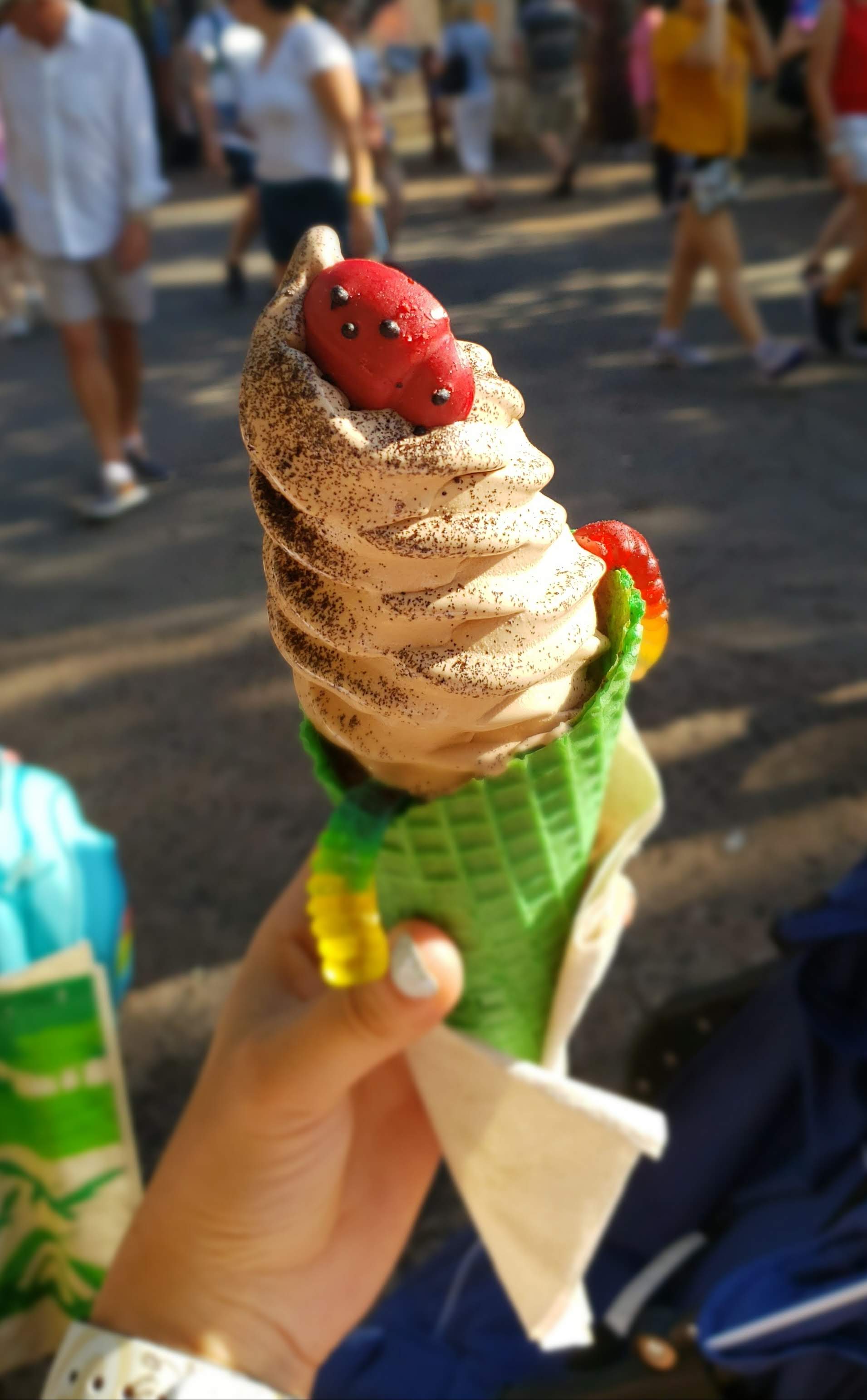 En sortant de la maison d’aventurier de Minnie et Mickey, nous jetons un coup d’oeil sur l’application du parc, et constatons qu’il n’y a que 10 minutes d’attente pour le spectacle « It’s Though to be a Bug », qui est juste à côté. En fait, cette attraction est située dans l’immense 3arbre de la vie » au milieu du parc. La file d’attente regorge de détails, d’animaux sculptés dans le bois. Plus on avance, plus les objets autour de nous deviennent gros. Nous voici réduits à la taille d’un insecte, comme dans le film « Mille et une pattes ». Munis de lunettes 3D qui nous donne l’air d’être des fourmis, on s’installe dans le tronc d’arbre, et on découvre un film, mais pas seulement. Sans trop en dévoiler, on peut simplement dire que le spectacle n’est pas que sur l’écran: il y a également plein de surprises dans la salle tout au long de la projection. En face, au-dessus, en-dessous. Un moment vraiment chouette, mais qui peut faire peur à certains enfants… ou aux arachnophobes.