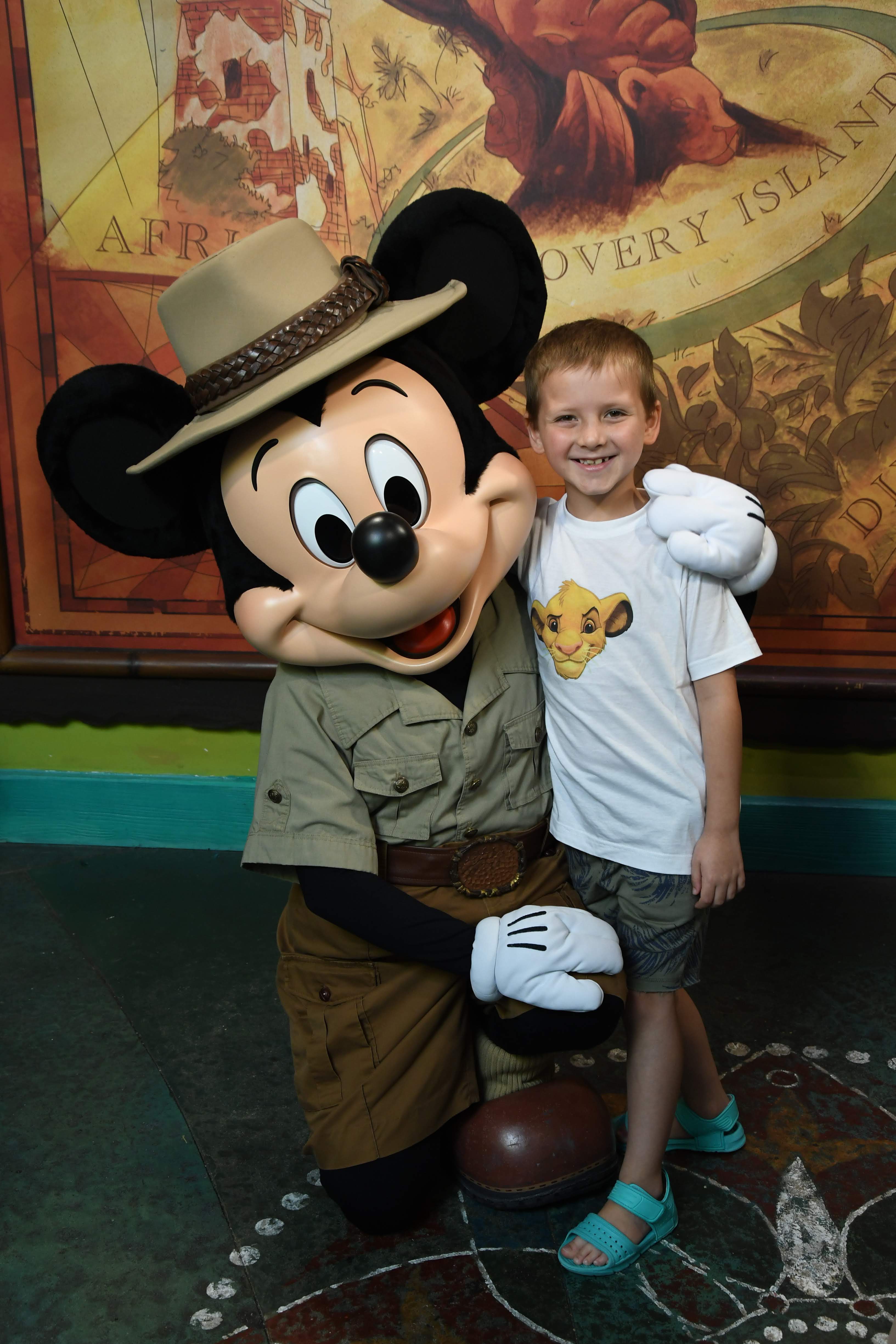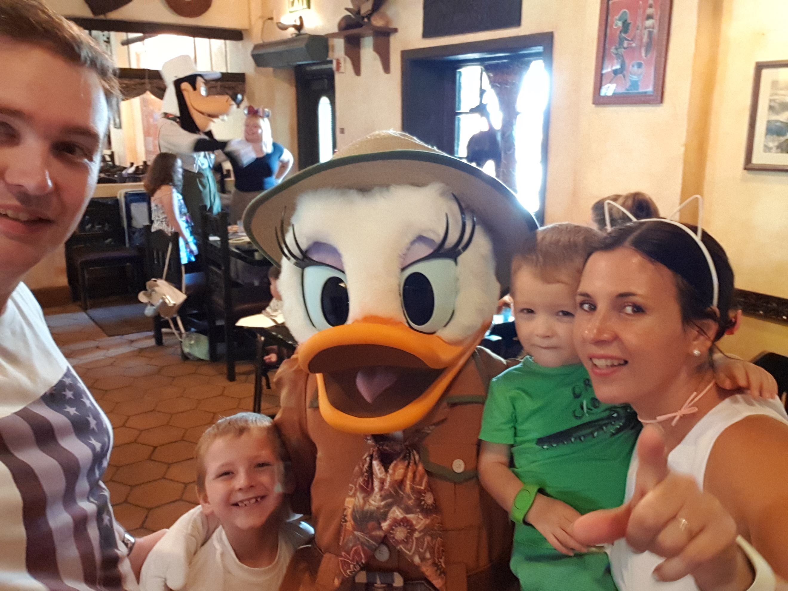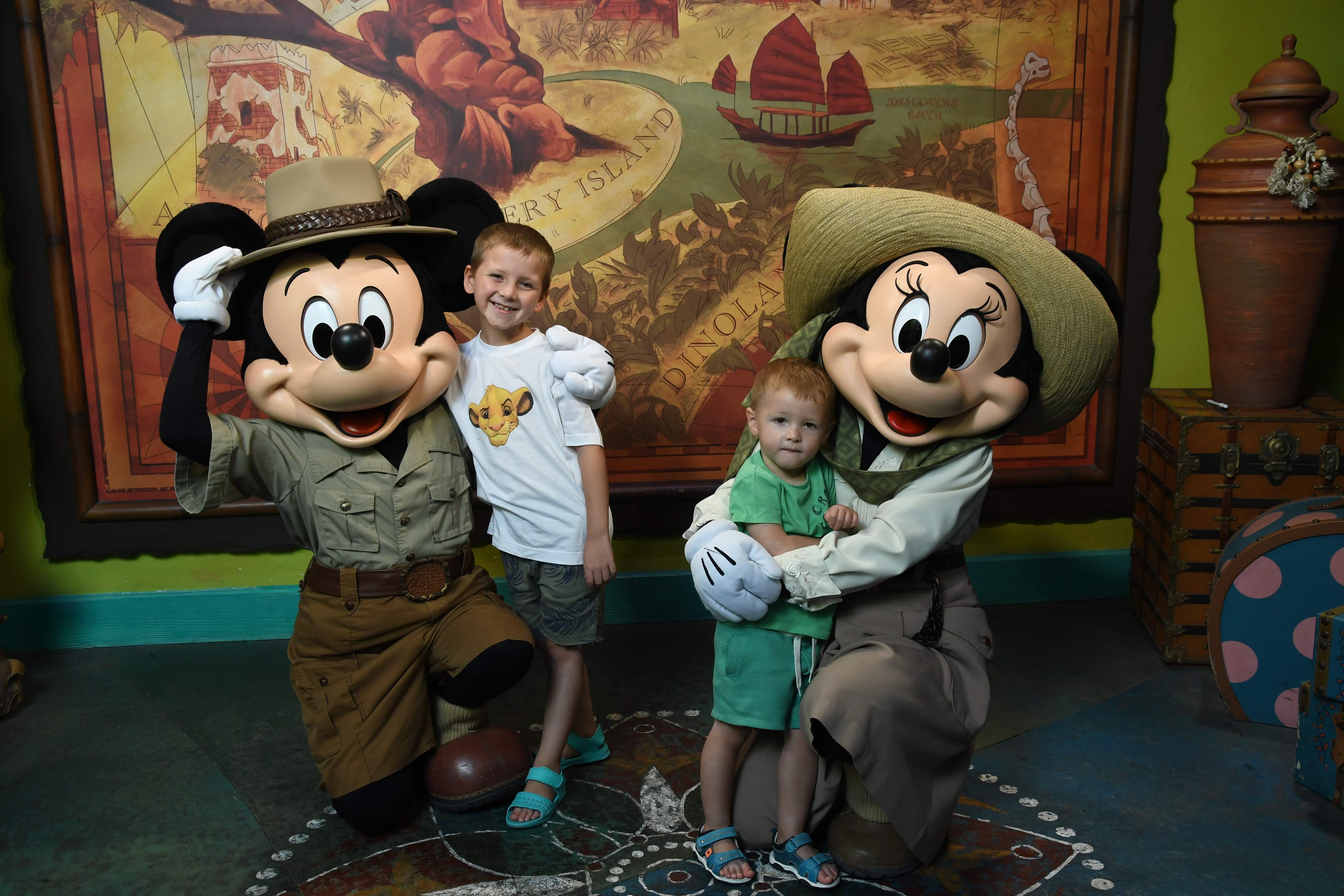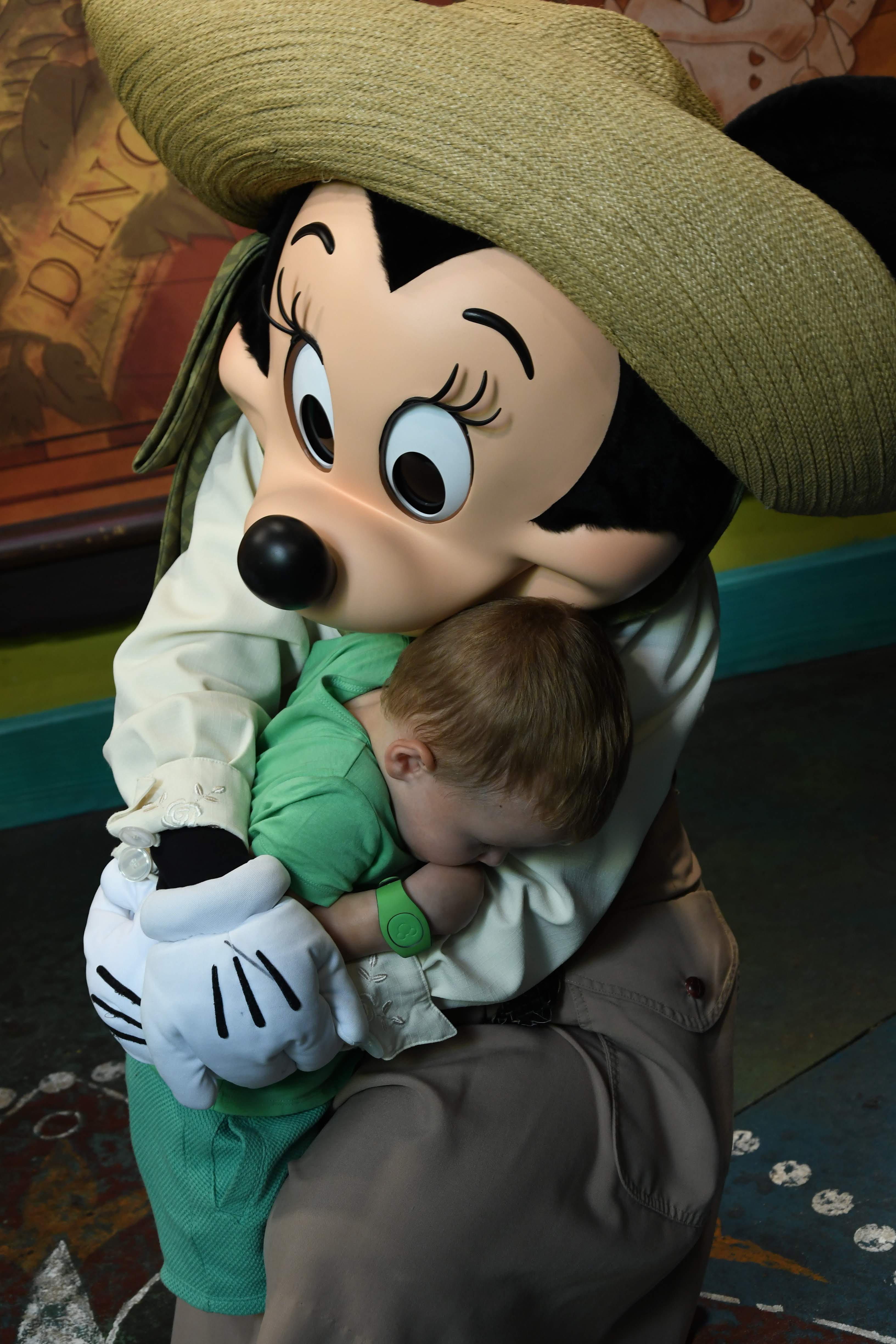 Un coup d’oeil sur le téléphone, et on se rend compte que c’est déjà l’heure de notre second Fastpass+. Bon, à vrai dire, ce n’est pas très grave si on ne l’utilise pas, car nous avons déjà rencontré Mickey et Minnie en tenue d’aventuriers quelques jours plus tôt. Mais puisqu’on a un Fastpass+, on y retourne: ça fait des photos souvenirs ! Les enfants sont ravis de revoir leurs personnages favoris. Gabin fait même un câlin interminable à Minnie !