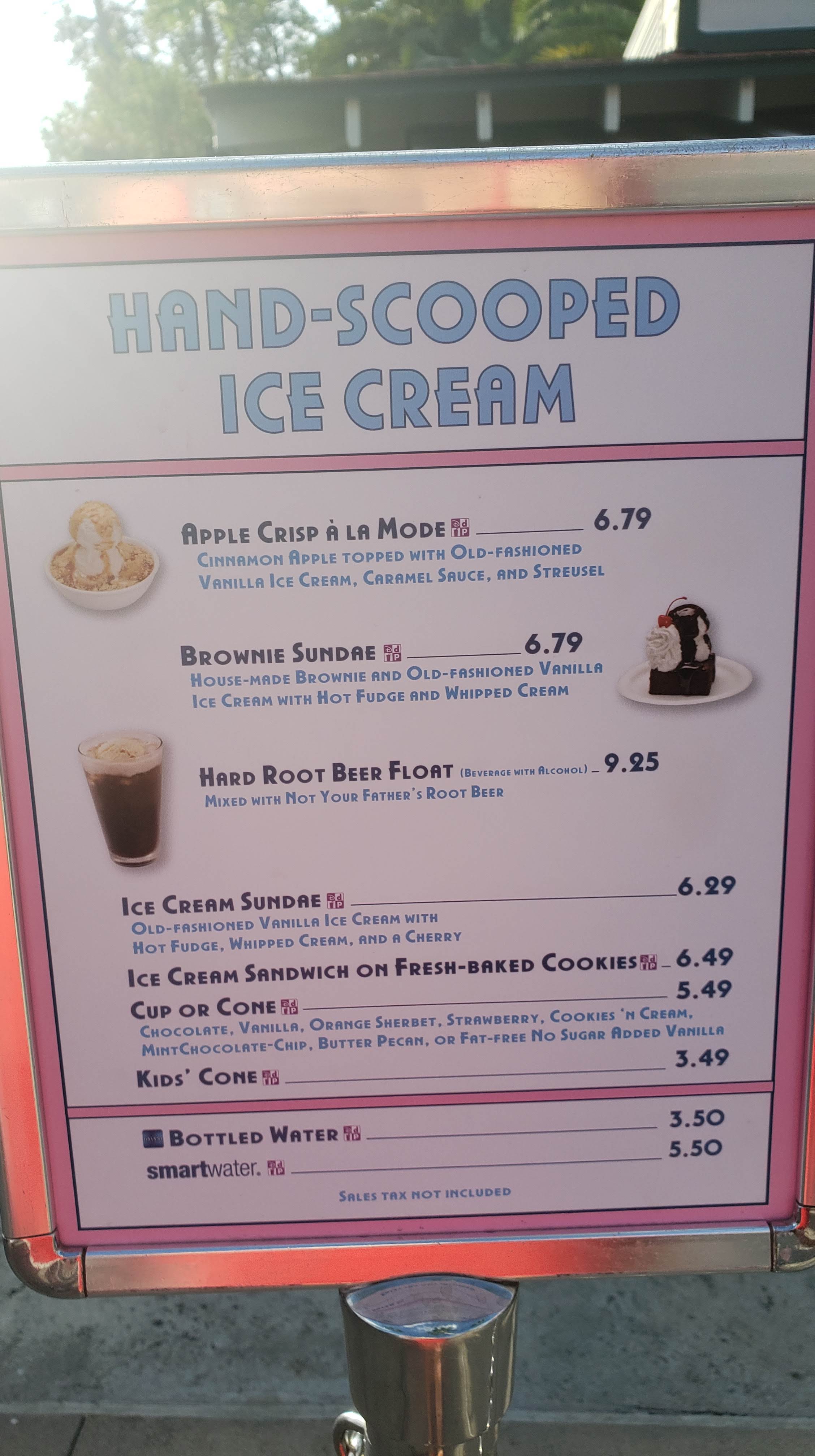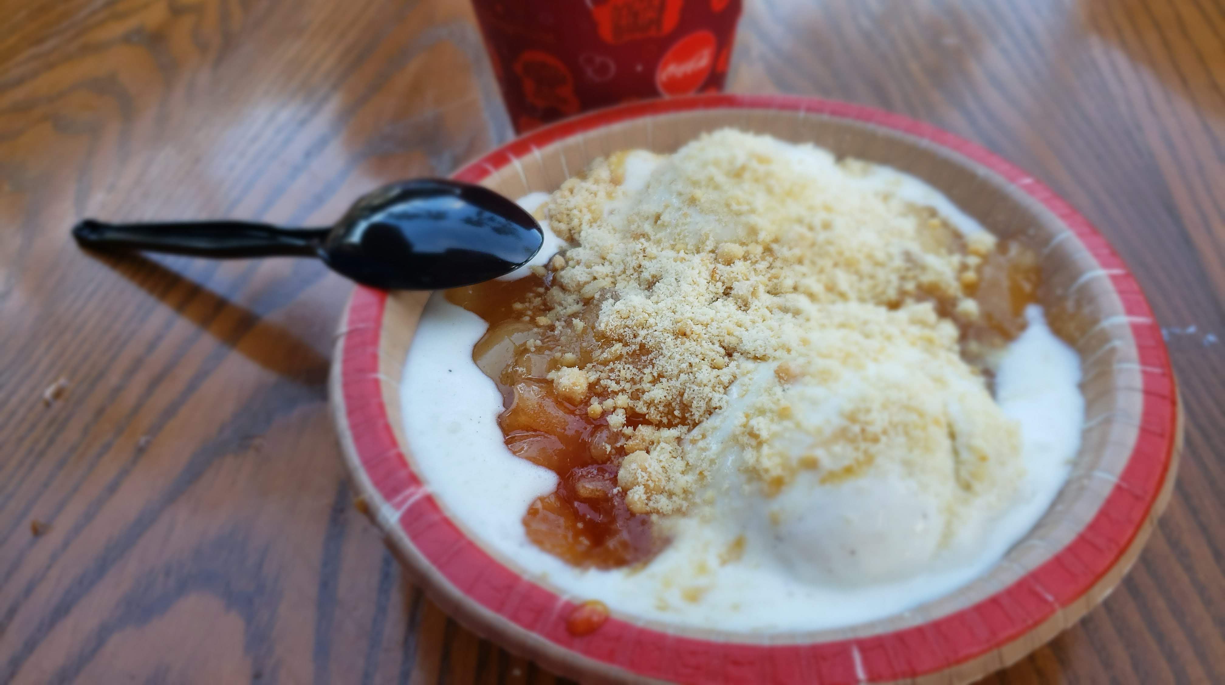 Alors qu’on se dirige vers la Hollywood Tower Hotel, nous passons devant les kiosques de nourriture et de bonnes odeurs nous chatouillent les narines. Par cette chaleur, on ne résiste pas longtemps à l’appel d’une bonne glace. Je craque pour un cookie glacé (une boule de glace crème-oréo coincée entre 2 énormes cookies). Tellement énormes que je partage avec les enfants. Amandine, elle, a choisi un Apple Crisp à la mode. Un crumble à la pomme avec de la glace vanille et du sirop de caramel. Un régal !