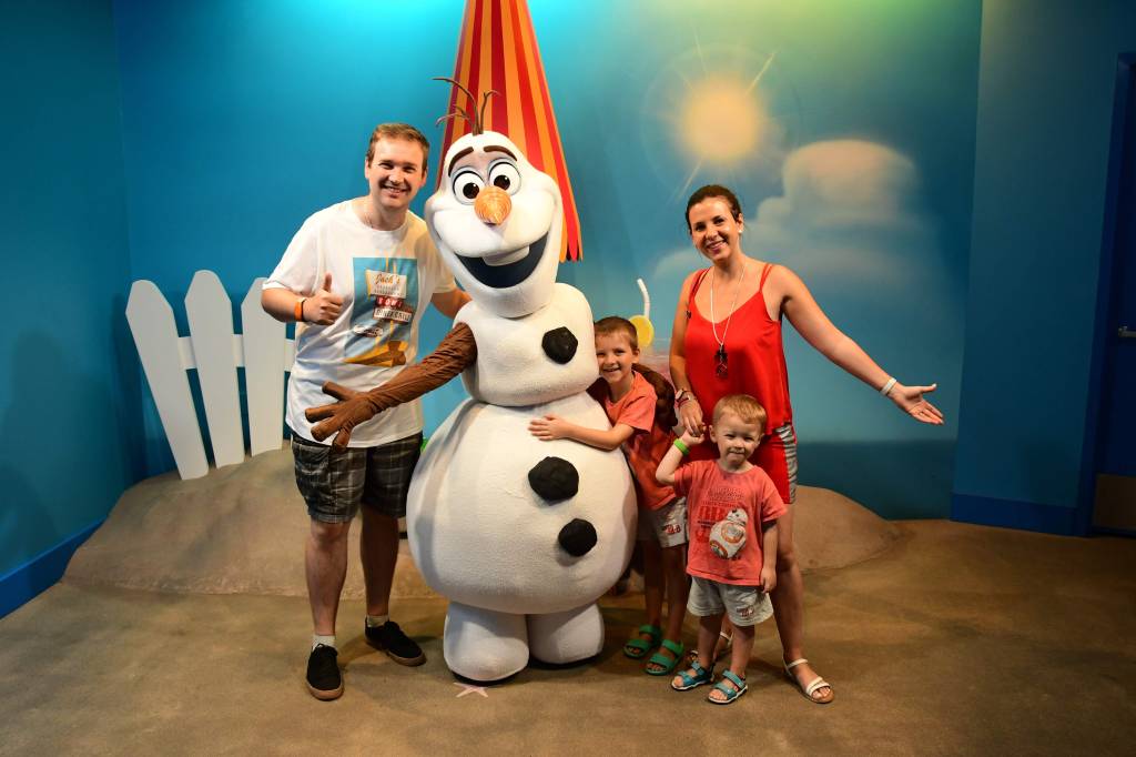Olaf fait partie des personnages pour lequel le temps d’attente grimpe assez rapidement. Mais à cette heure-ci, il n’y a que 5 petites minutes à patienter pour faire un gros câlin au plus célèbre des bonhommes de neige. Le décor pour la photo est superbe, et on reçoit une carte postale en forme de ballon de plage, avec au dos, un autographe d’Olaf. Un souvenir de plus à rajouter dans notre album de voyage !