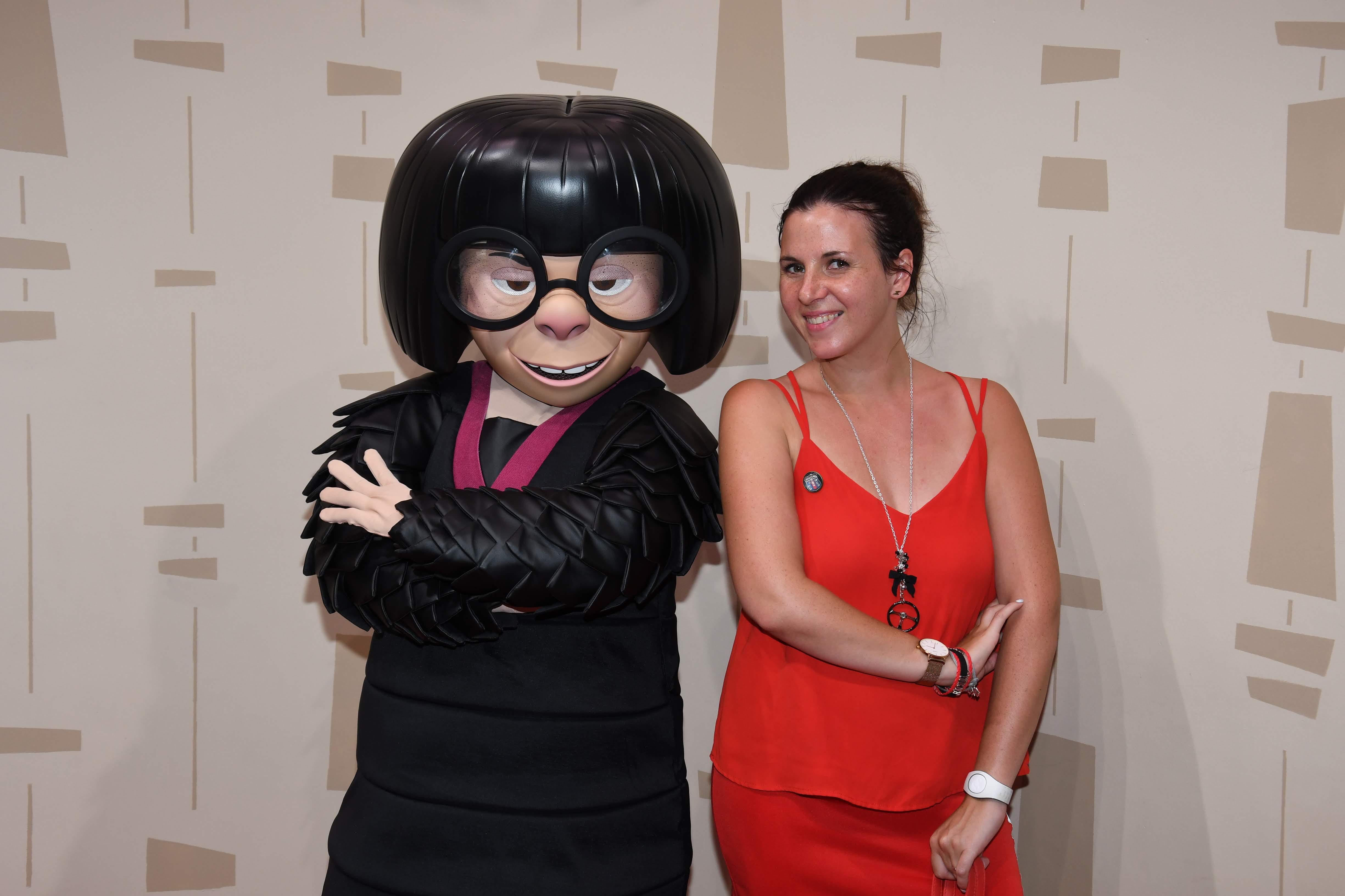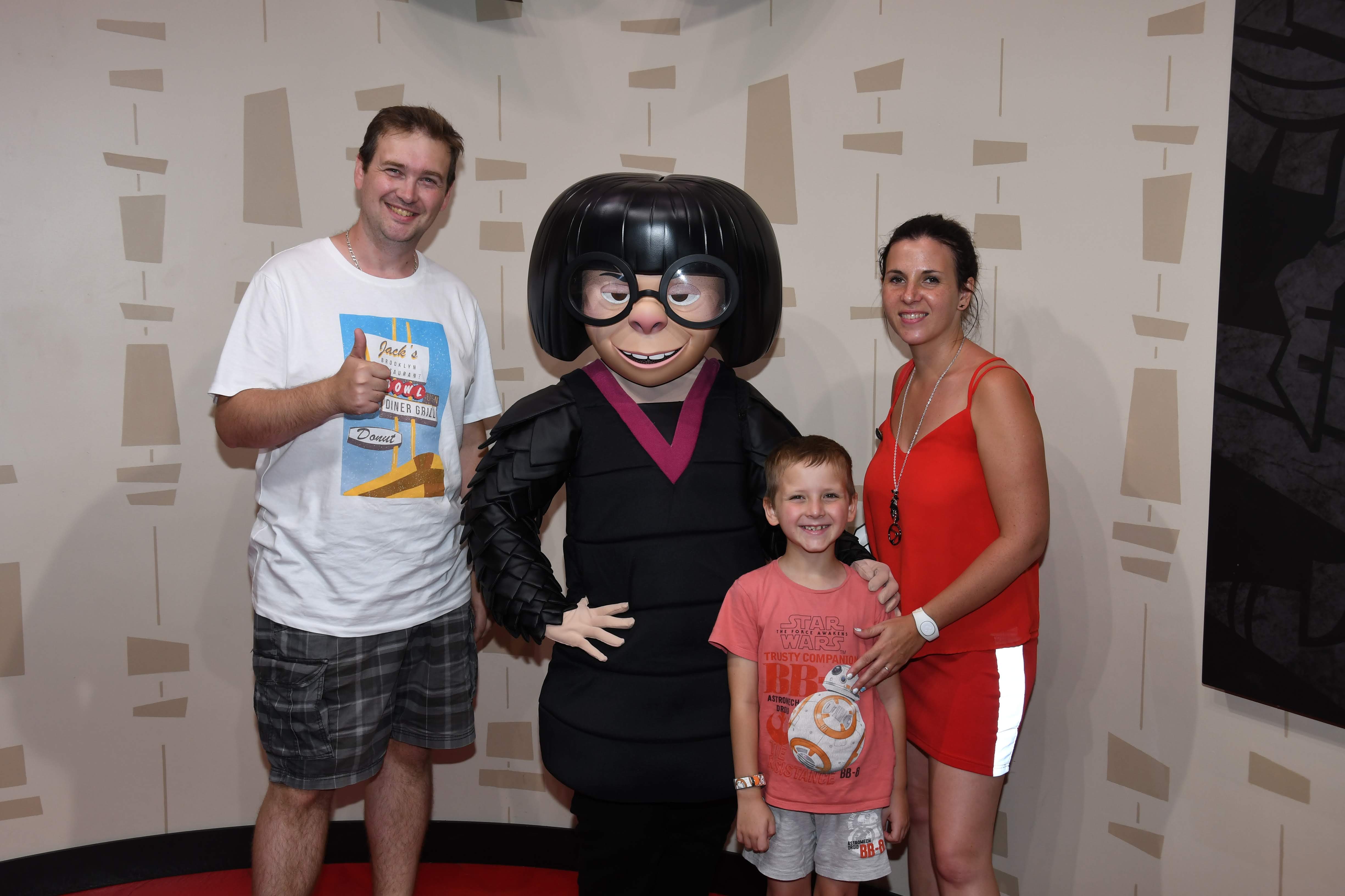 En longeant la rue, on passe devant un grand bâtiment qui expose des vêtements conçus par Edna Mode, la styliste qui confectionne les costumes de super-héros des Indestructibles. Il s’agit en fait de la file d’attente pour faire la photo avec Edna Mode. Il n’y a absolument personne, et nous faisons la photo tout de suite.