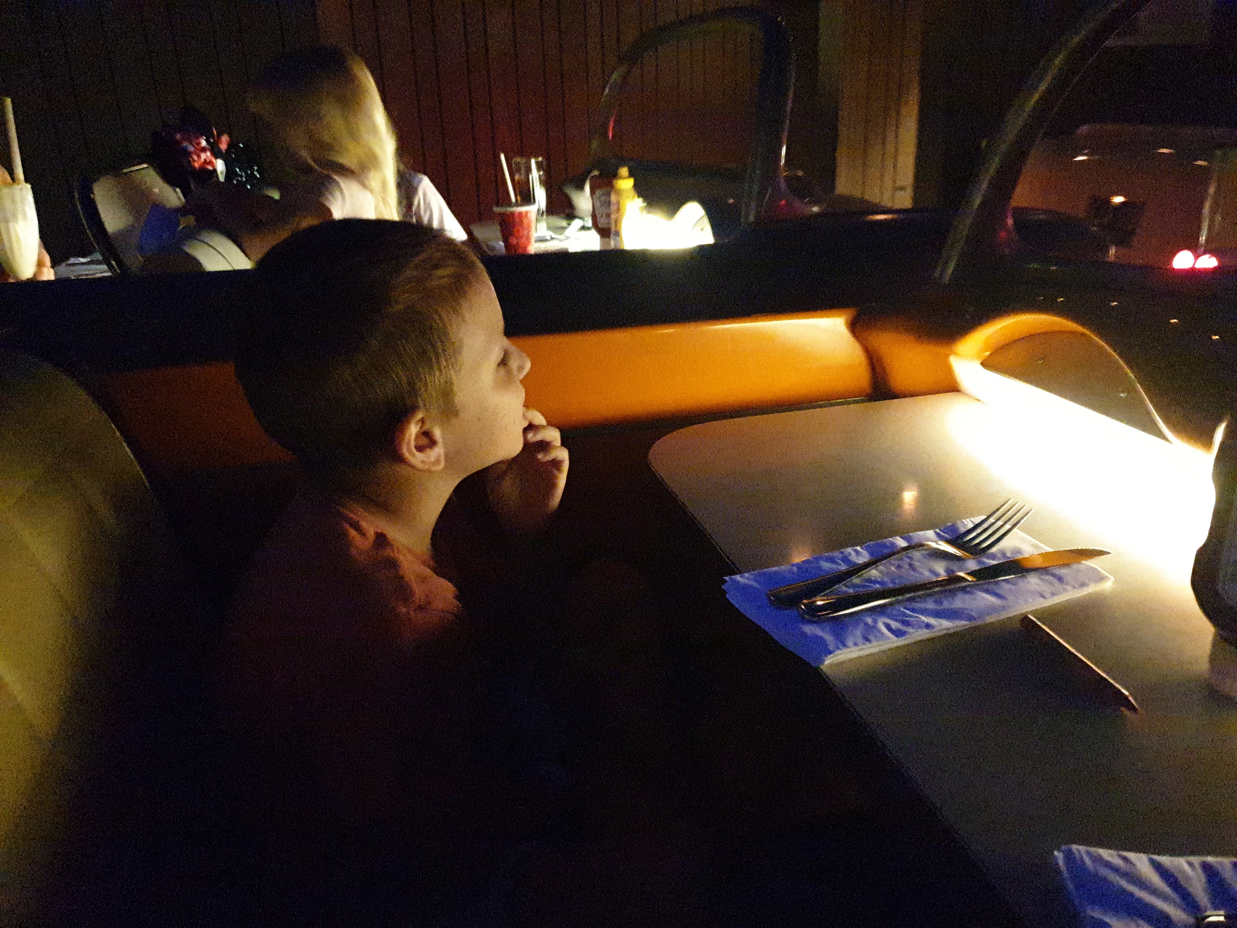 Après avoir attendu 15 minutes, pot de pop-corn à volonté, une serveuse vient nous chercher pour nous placer à notre table (ou plutôt notre voiture). Au menu: des burgers avec onions rings pour Amandine et moi, des mac&cheese pour les enfants. A noter que depuis le début du séjour, c’est le premier restaurant à service à table pour lequel nous avons dû payer l’assiette de Gabin. Jusqu’à présent, il pouvait toujours avoir un plat gratuit, ou partager le menu de son grand frère. Bon, pour 6 dollars, on n’a pas cherché à comprendre…