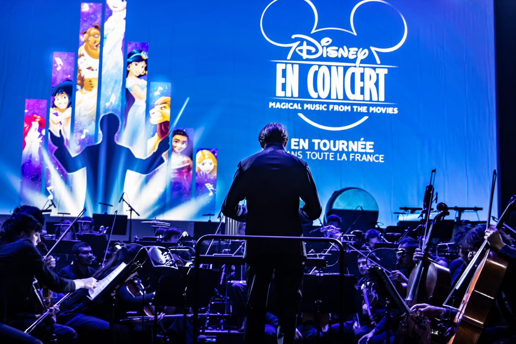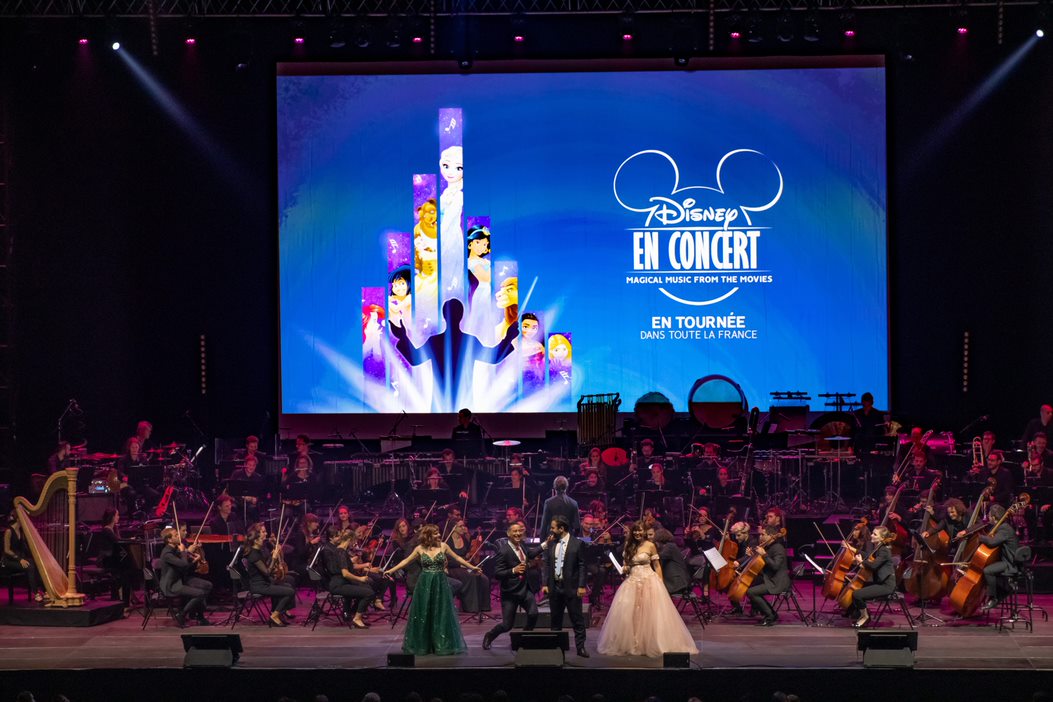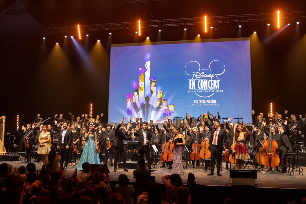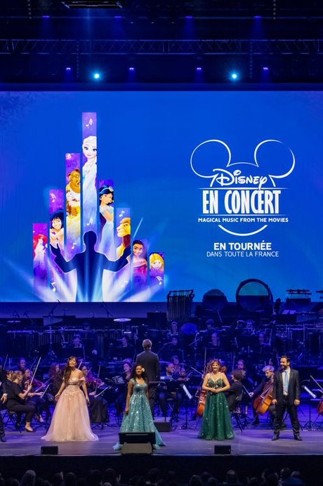 Spectacle hybride entre projection cinématographique et concert classique, le « ciné-concert » séduit petits et grands, et gagne les principales salles de spectacles et Zénith de France. Les musiques sont interprétées en live, et les images des dessins animés sont diffusées en simultané sur un écran géant. Simultanément aux séquences projetées, les chanteurs professionnels Emily Pello, Dan Menasche, Judith Derouin et Igor Bouin, incarnent les voix de ces héros Disney. Charlotte Hervieux, qui prête sa voix à la Reine des Neiges, et Cerise Calixte, doublure vocale de l’héroïne Vaïana, sont les invitées de marque de la tournée.