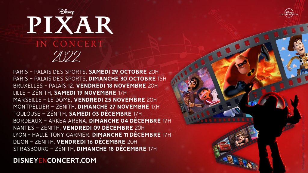 Rémy, Nemo, Wall-E, Woody ou bien encore Carl et Ellie. Voici quelques-uns des héros Pixar adorés par tous. A partir du 29 octobre 2022, pour la première fois partout en France et en Belgique, un orchestre symphonique complet, composé de près de 100 musiciens, interprètera les extraits musicaux de 13 longs-métrages des studios Pixar tels que Ratatouille, Toy Story, Cars, Monstres & cie, Rebelle, Les Indestructibles ou Là-Haut.