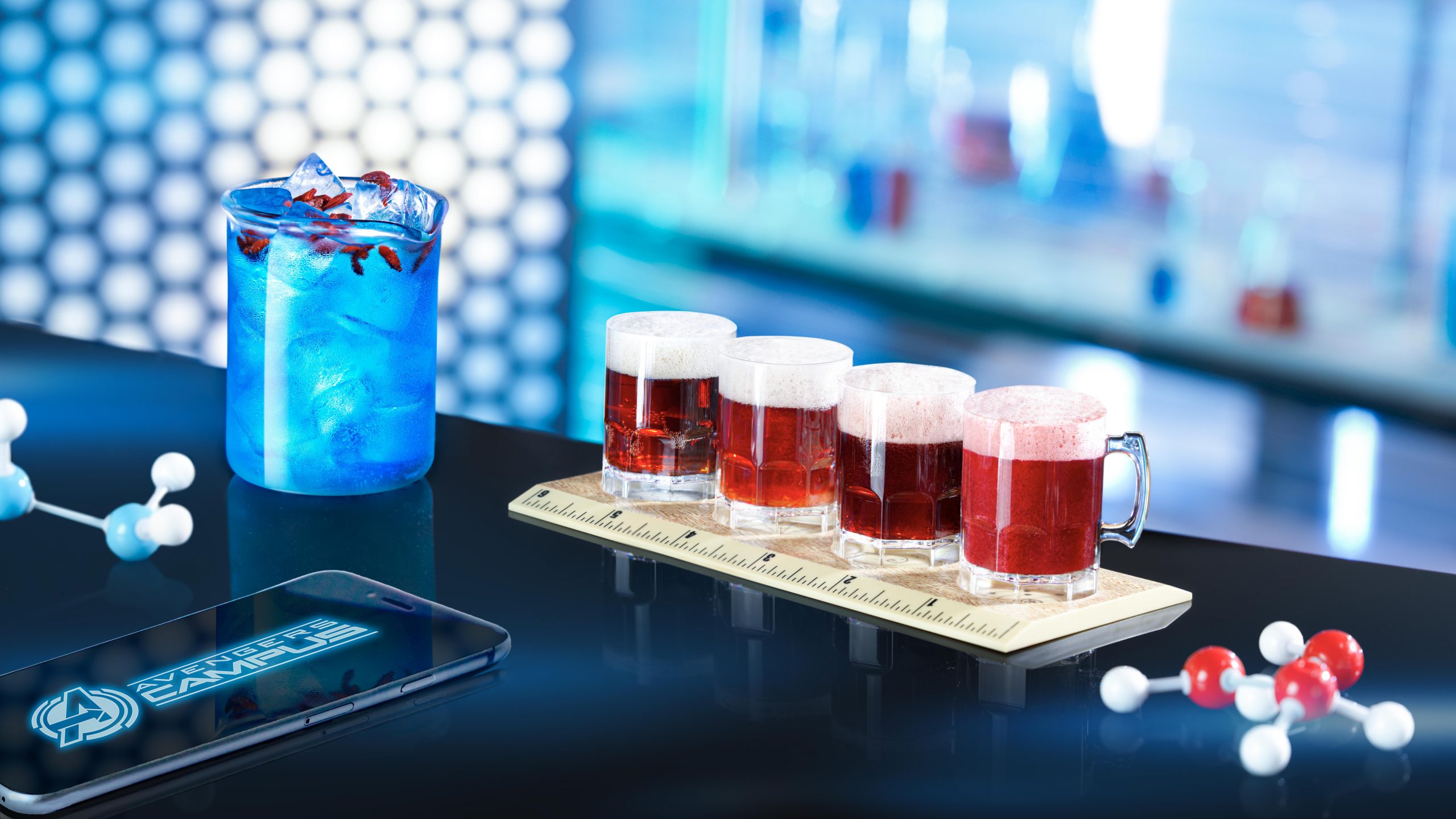 Côté boissons, les adultes pourront déguster du vin rouge servi dans des fioles (le rouge est la couleur de la particule de Pym permettant de rétrécir les objets), savourer une sélection de quatre bières miniatures servies dans des verres souvenir. Disney proposera également un clin d’œil à la particule de Pym qui permet d’agrandir les objets en ajoutant à sa carte un Chardonnay bleu. « Un cocktail signature rouge et bleu ainsi qu’un cocktail aux superaliments, composé de Chardonnay, de Perrier, de Martini et de baies de goji seront également proposés* »