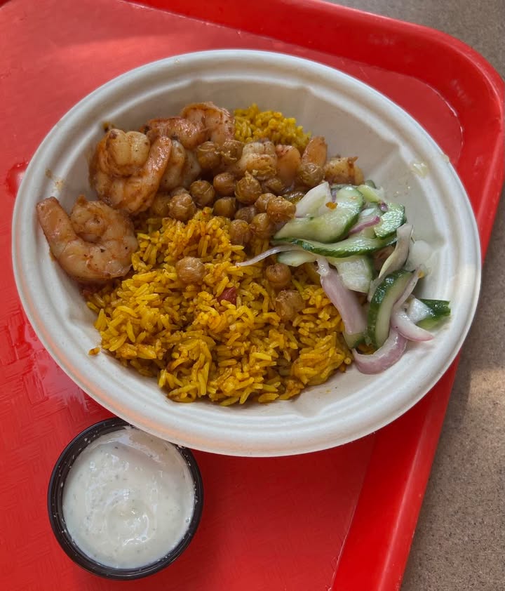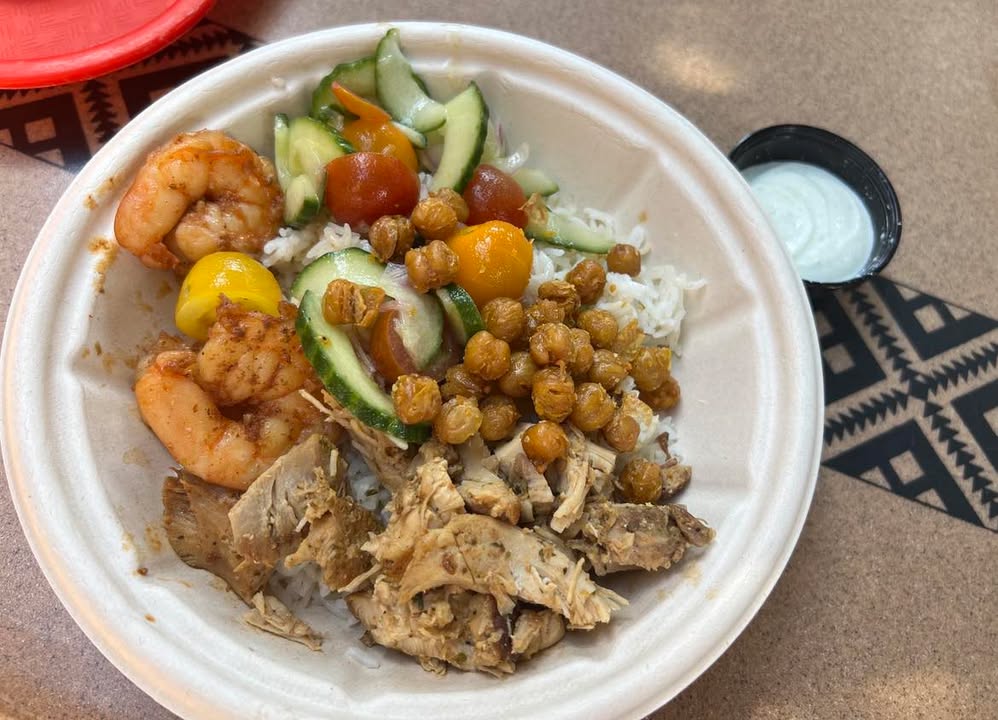 - Bols chauds : À base de riz « Jollof », avec du poulet mariné et/ou des crevettes marinées, accompagnés d’une salade de tomates-concombres-oignons, pois-chiches et de sauce Tzatziki.