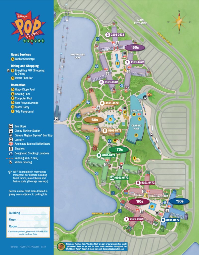 Proche du parc Hollywood Studios, le Disney’s Pop Century Resort offre plusieurs moyens de transport pour rejoindre les parcs. Les parcs Hollywood Studios et Epcot sont desservis par le Skyliner (comptez 5 à 10 minutes de trajet), avec un changement à effectuer à l’hôtel Carribean Beach Resort. Les parcs Magic Kingdom et Animal Kingdom sont desservis par les bus.