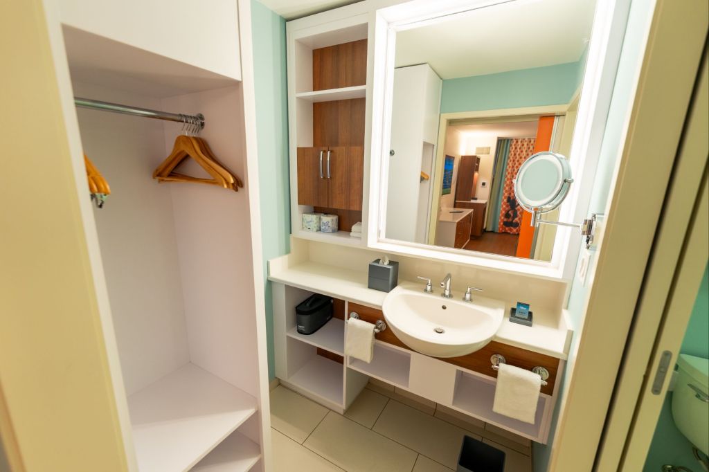 Il y a plusieurs prises électriques, avec prises USB intégrées. Les chambres disposent d’un coffre-fort, d’une grande télévision diffusant les horaires des parcs, la météo, d’autres infos pratiques, les chaînes de télé américaines, et des chaînes de télé Disney. Dans la salle de bain se trouvent une planche à repasser, un fer, un sèche-cheveux.