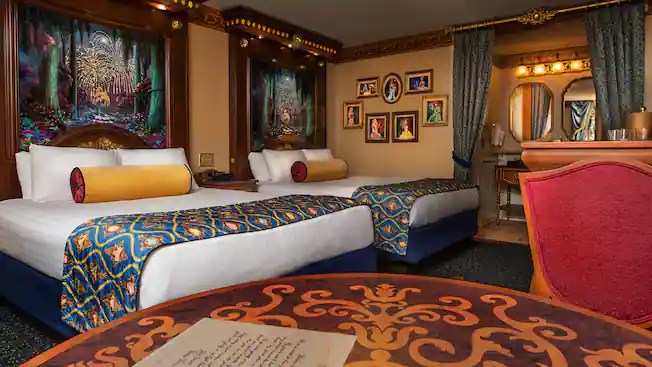 Dans chaque chambre se trouve un réfrigérateur, une cafetière, avec des dosettes de café et des sachets de thé, et un coffre-fort. Il y a plusieurs prises électriques, avec prises USB intégrées. Les chambres disposent d’une grande télévision, diffusant les horaires des parcs, la météo, d’autres infos pratiques, les chaînes de télé américaines, et des chaînes de télé Disney. Dans la salle de bain se trouvent une planche à repasser, un fer, un sèche-cheveux.