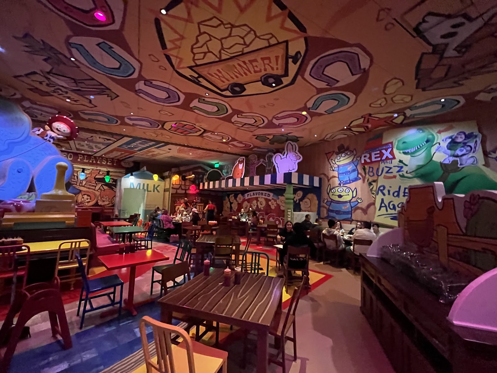L’ambiance du Roundup Rodeo BBQ est conçue pour vous plonger directement dans l’univers de Toy Story. Le restaurant est décoré comme une grande aire de jeu imaginée par Andy, avec des jouets géants et des figurines de personnages emblématiques.