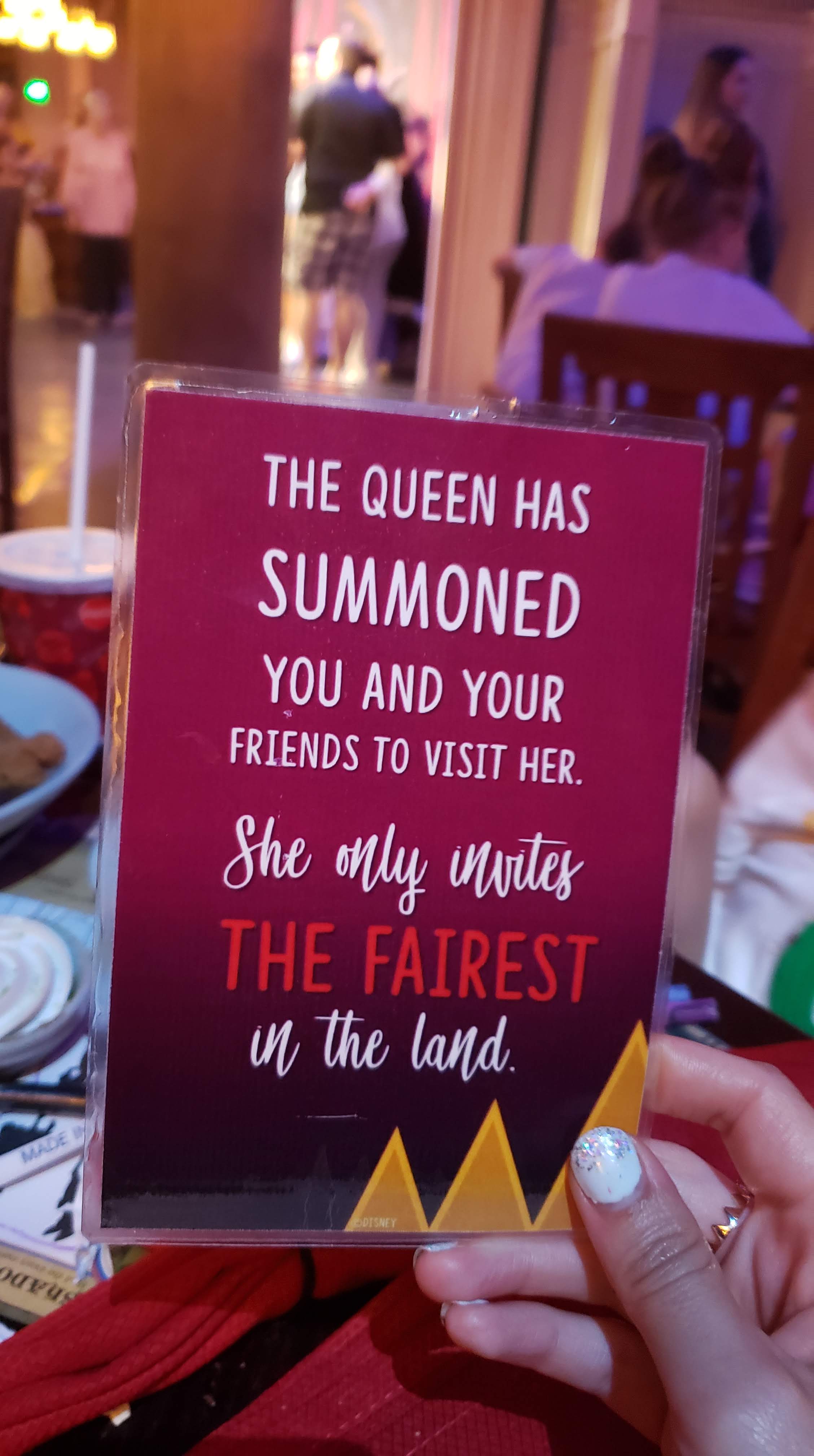 Le restaurant recrée l’atmosphère de Blanche Neige et les Sept Nains avec des décors boisés, des lumières tamisées et une touche de féérie dans chaque détail. Les personnages de Blanche-Neige, Grincheux et Simplet se promènent parmi les tables, interagissant avec vous lors du repas. Vous recevrez également une invitation pour aller rencontrer la Méchante Reine et prendre la pose à ses côtés.