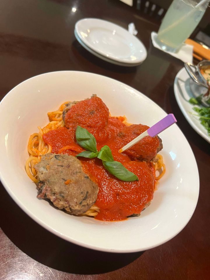 - Des plats, dont l’iconique plat de spaghetti aux boulettes de viande du film. Mais aussi, différents plats de pâtes, du poulet à la parmesane, du bœuf braisé dans une sauce au pepperoni ou le poisson du jour.